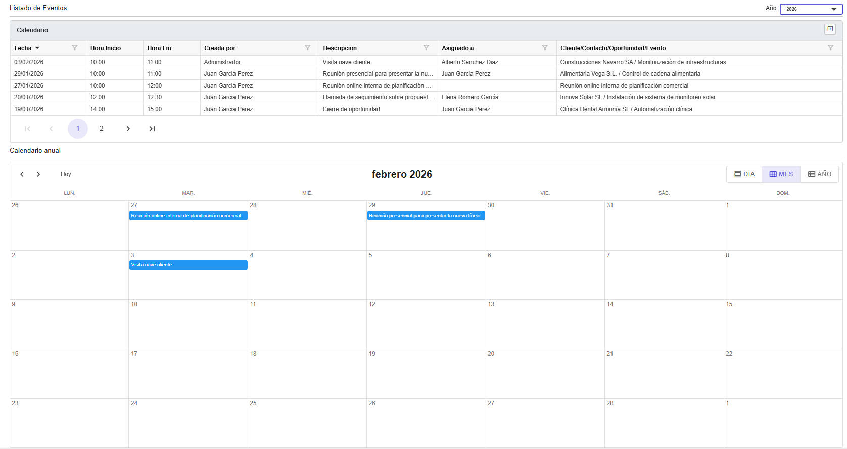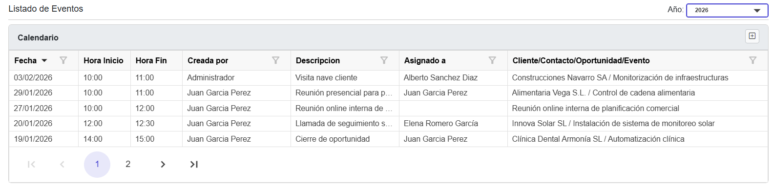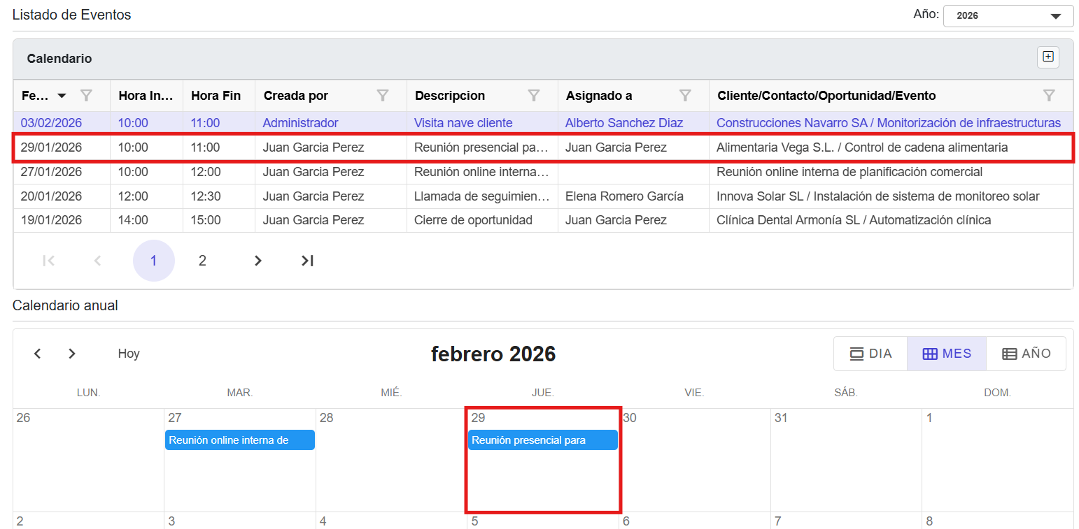 ✅ Gestión rápida de eventos desde la tabla o directamente desde el calendario.