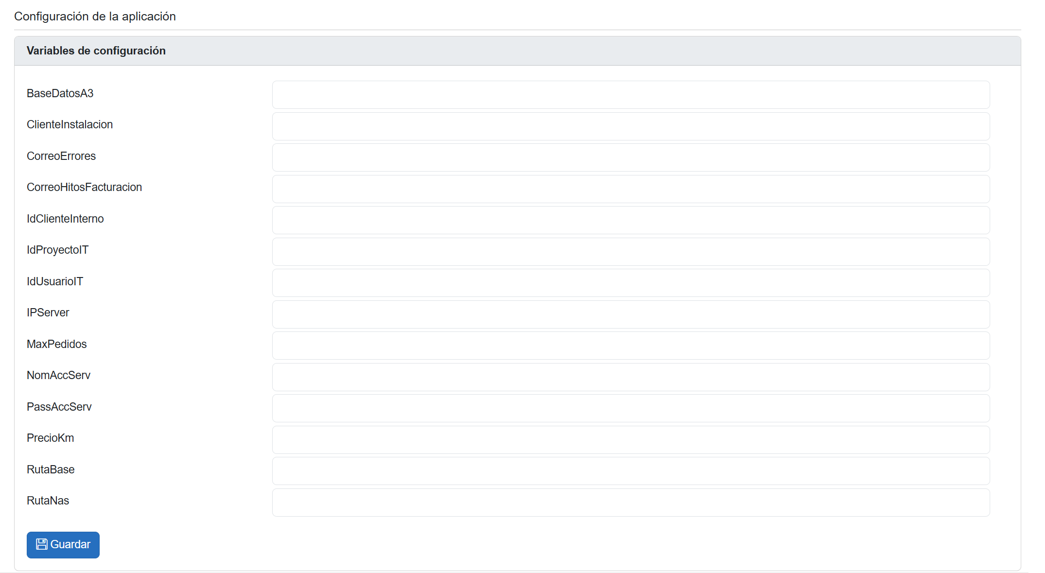 Su objetivo es consultar y actualizar variables como rutas, identificadores, límites operativos o datos de conexión. Cualquier cambio aplicado afecta directamente al comportamiento general de la aplicación.