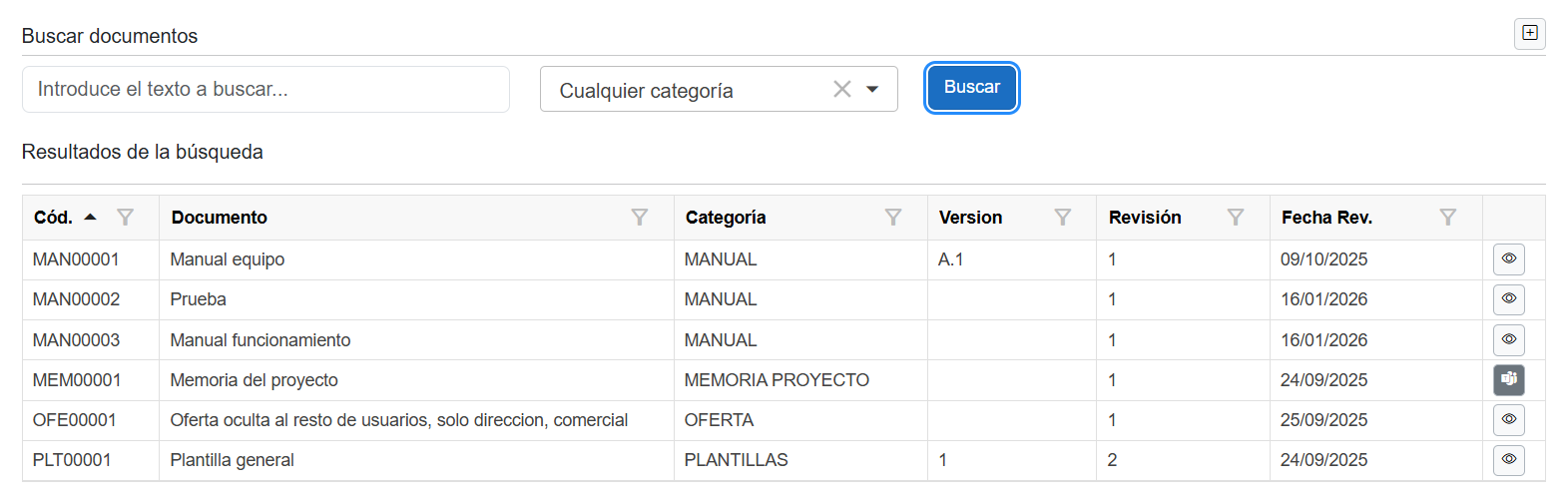 Facilitar la búsqueda y consulta de documentos corporativos mediante un sistema de filtrado por texto y por categoría, permitiendo al usuario acceder a la última versión registrada de cada archivo.