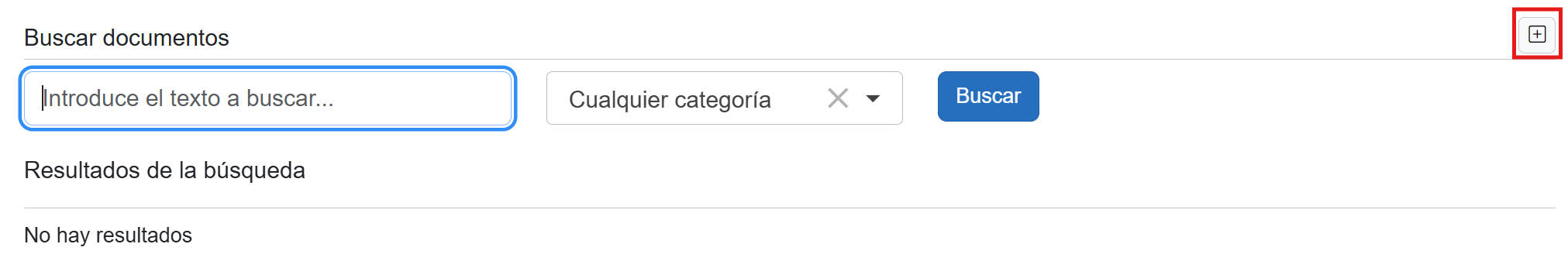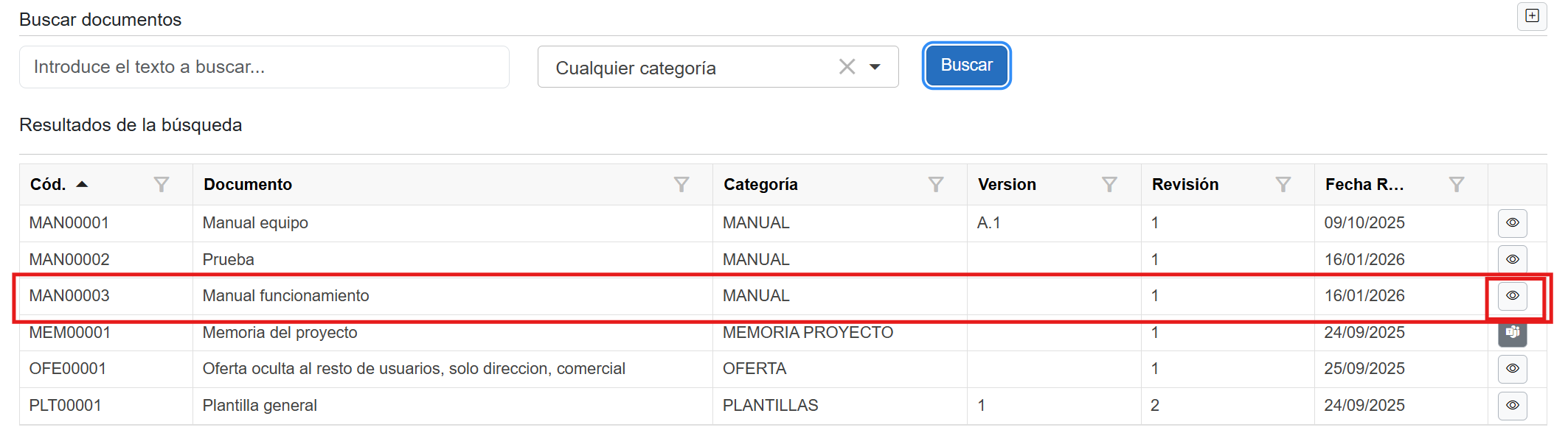 B) Resultados de la búsqueda Tras realizar la búsqueda, se muestra una tabla con los documentos que cumplen los criterios seleccionados. ![]()