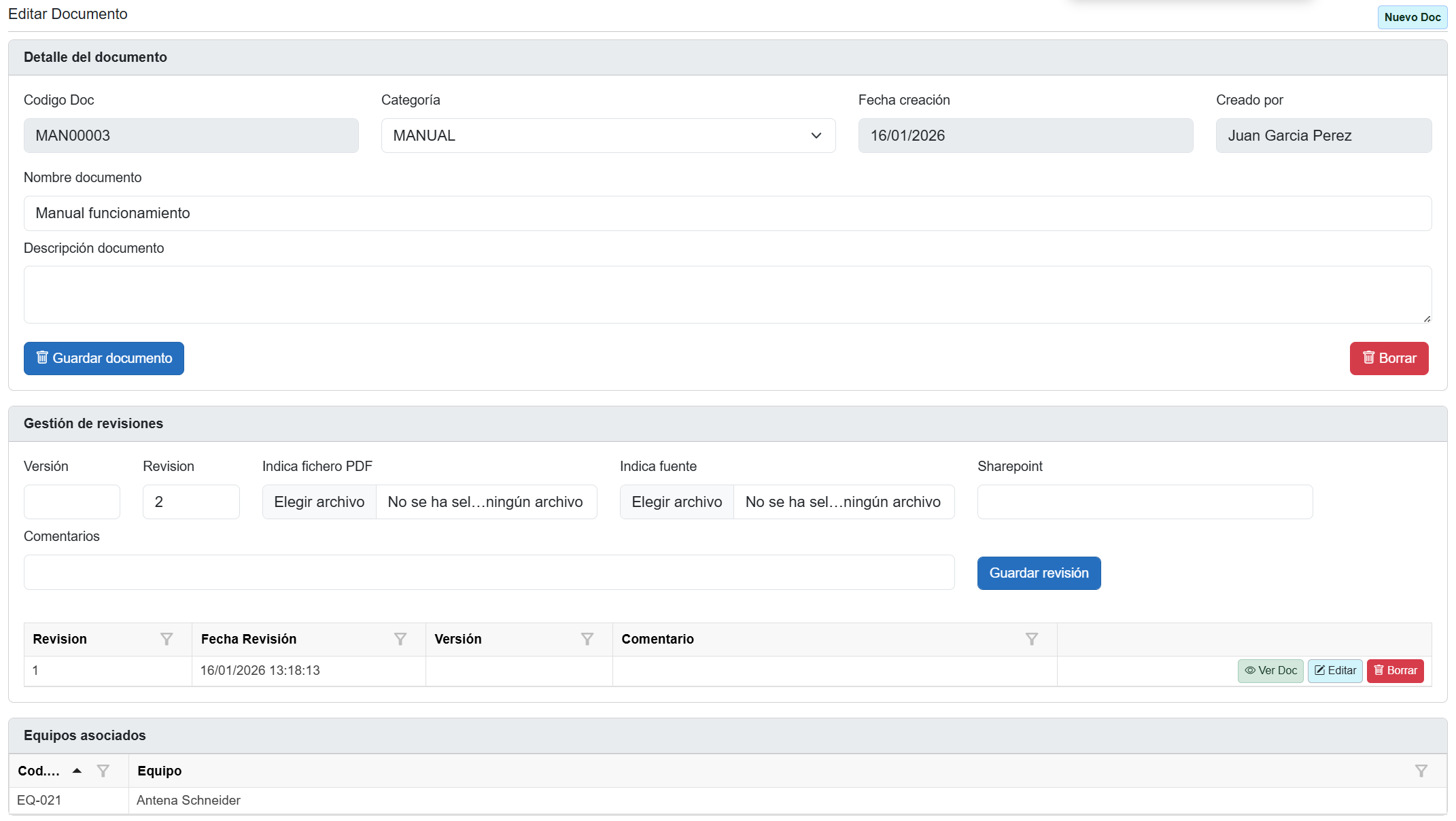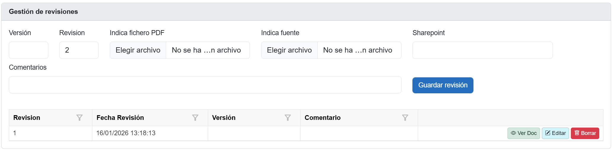 ✔ Gestión de revisiones ![]() Esta área permite añadir, consultar y actualizar las revisiones asociadas a la versión vigente del documento.