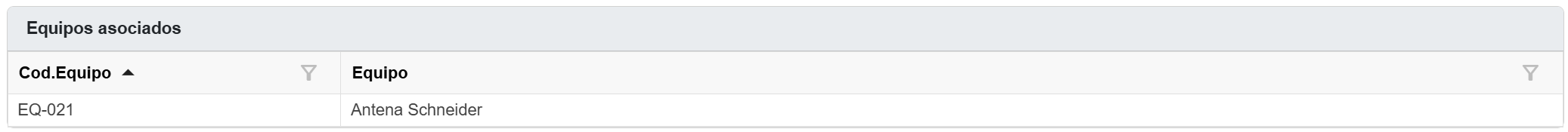 ✔ Equipos asociados ![]() En la parte inferior aparece la tabla de equipos vinculados al documento, en caso de que este forme parte de la documentación técnica de un equipo específico.