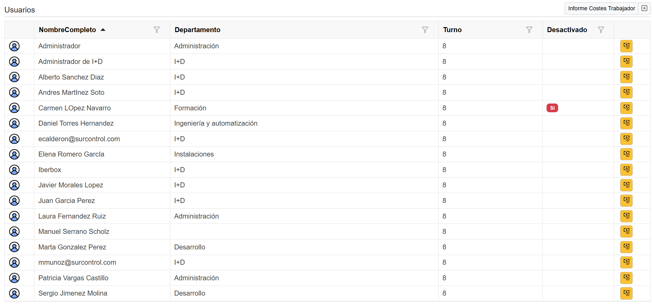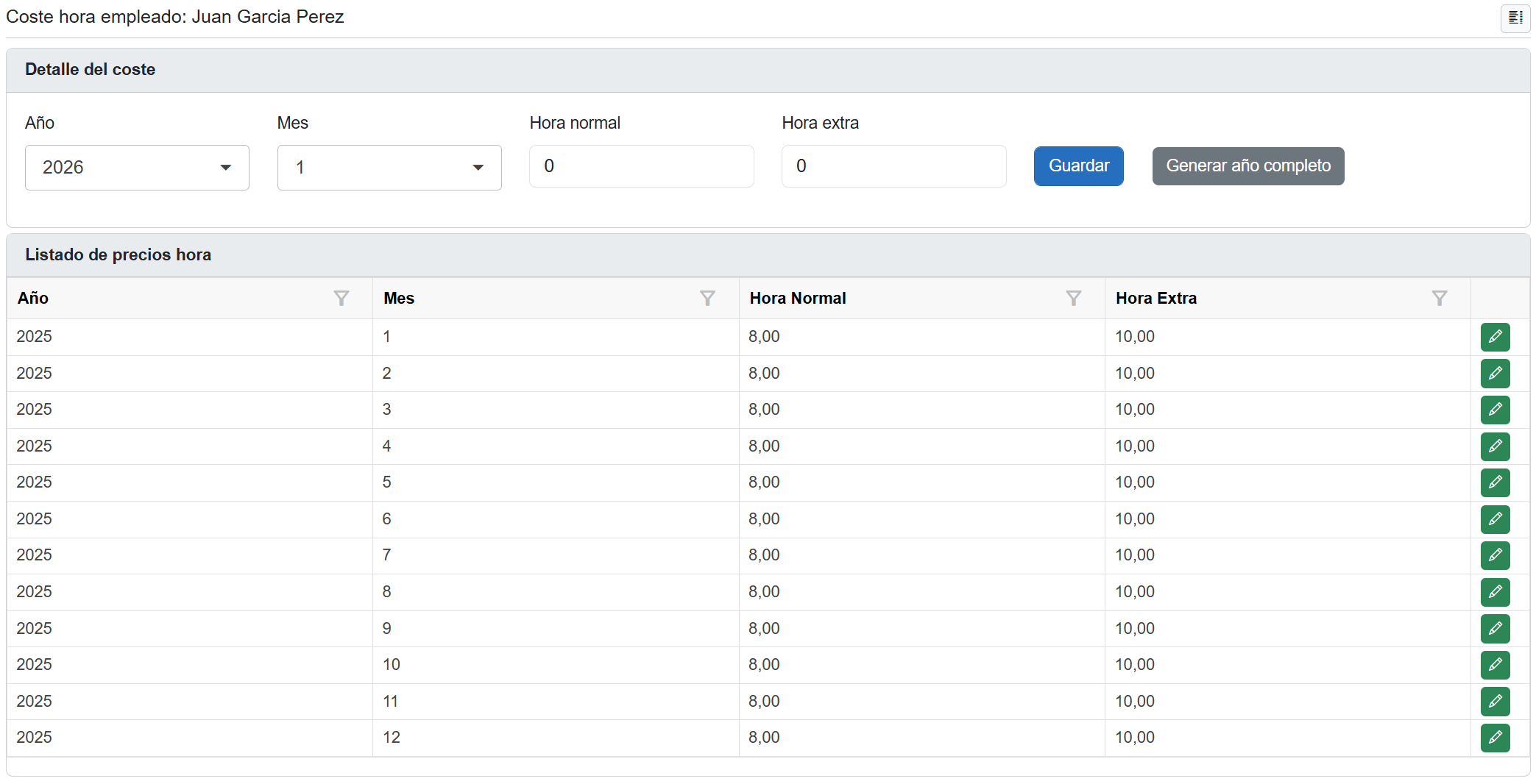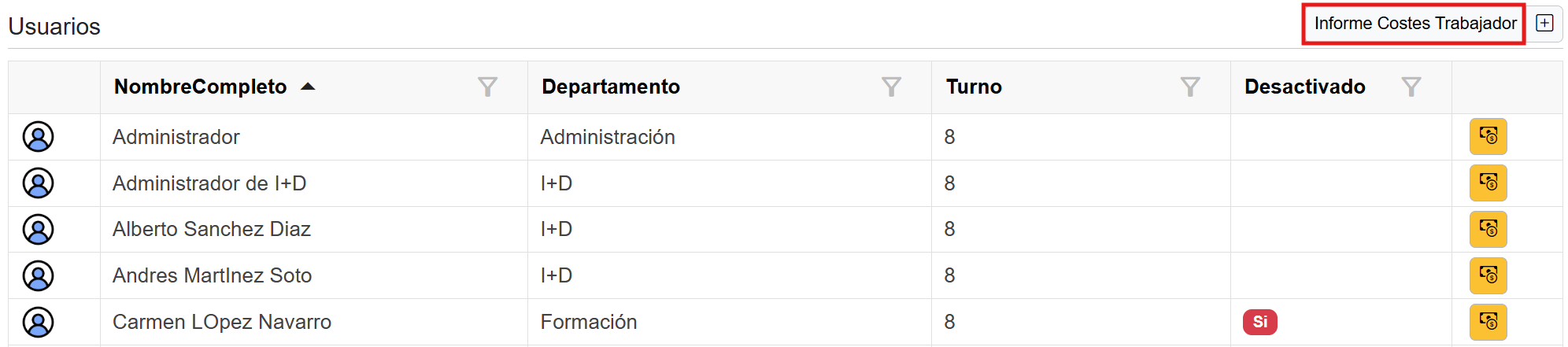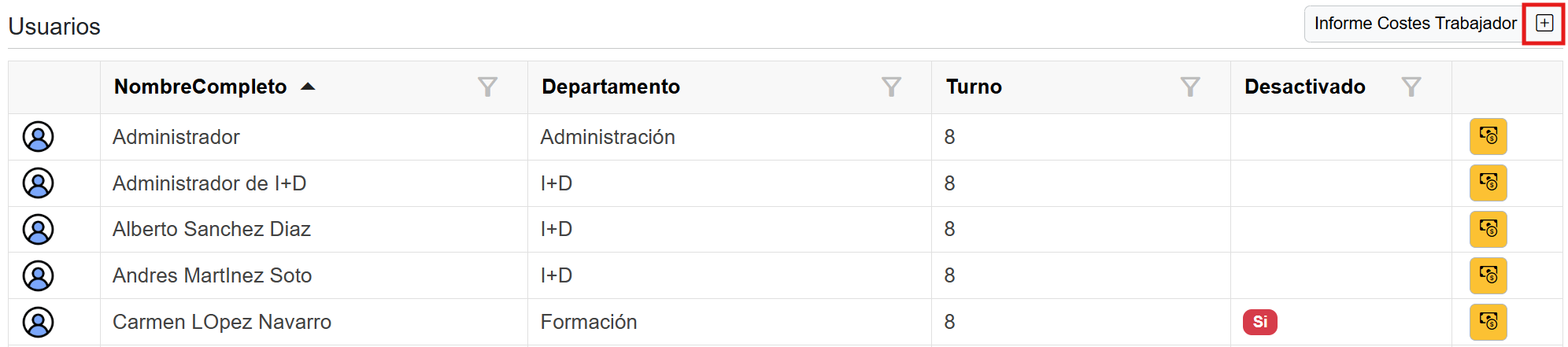 Desde aquí se pueden registrar nuevos empleados, editar los existentes y exportar informes relacionados con costes y horas imputadas.