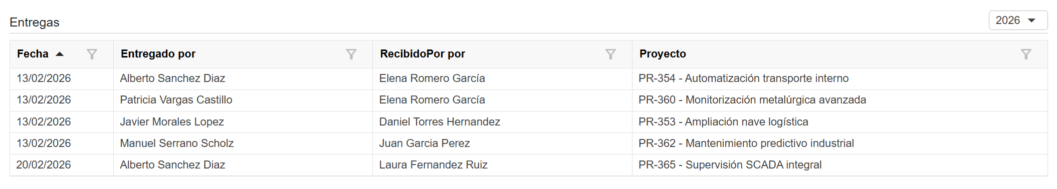 La tabla principal muestra todas las entregas registradas en la empresa, permitiendo filtrar por fecha, responsable o proyecto. ![]()