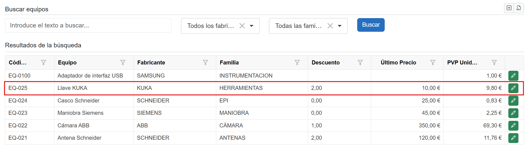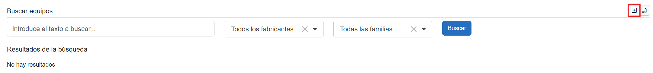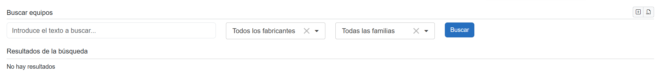 ✔ Búsqueda de equipos En la parte superior, busca por texto, filtra por fabricantes y familias, y pulsa Buscar. ![]()
