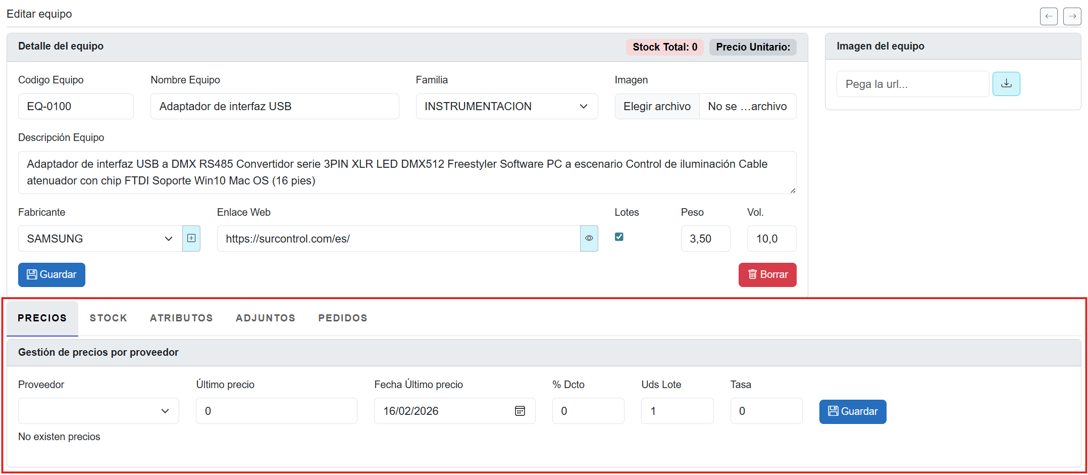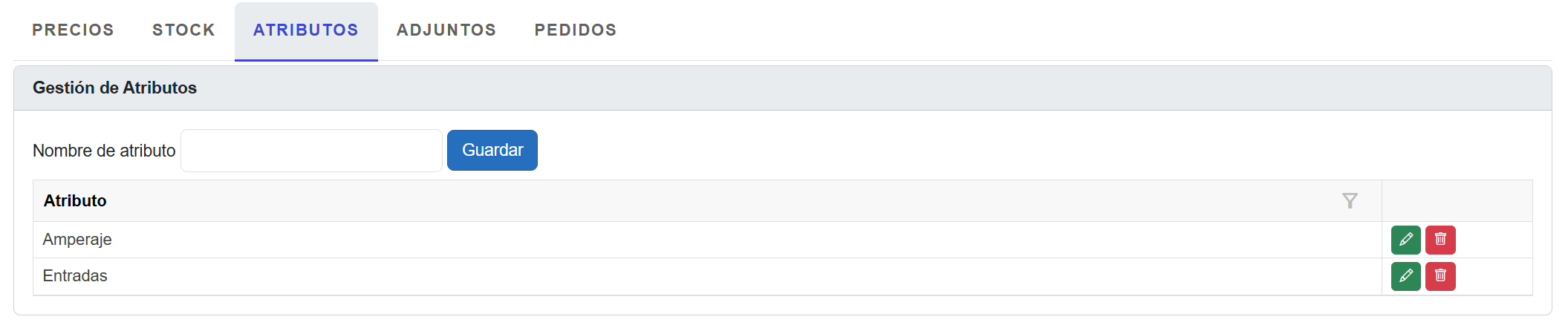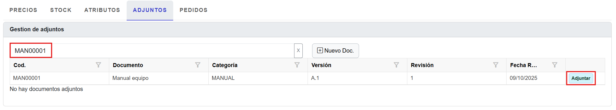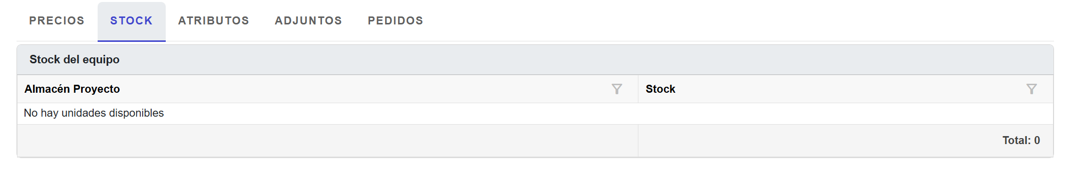 4. Se desplegarán las pestañas PRECIOS, STOCK, ATRIBUTOS, ADJUNTOS y PEDIDOS en la parte inferior de la ventana: ![]()