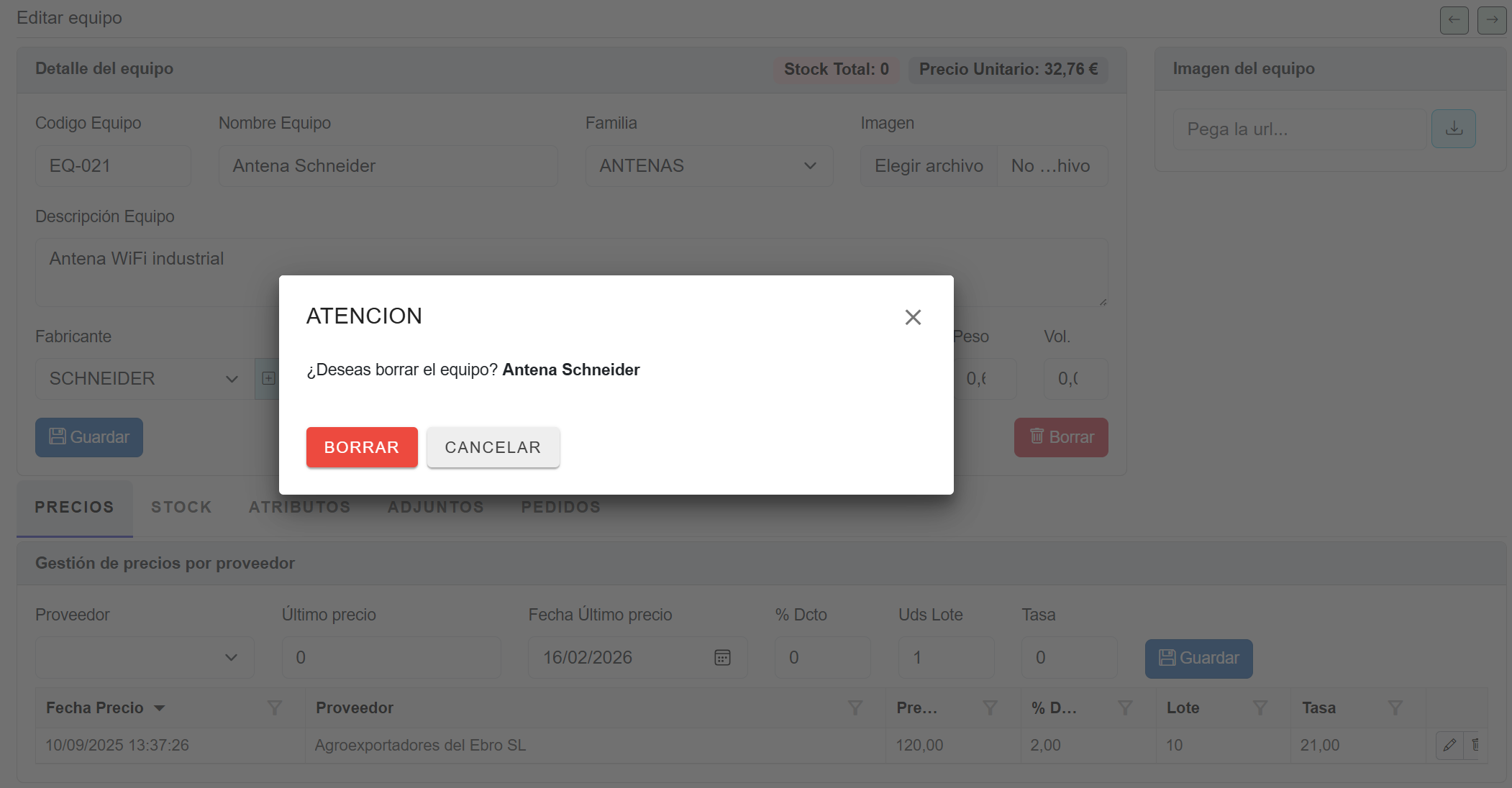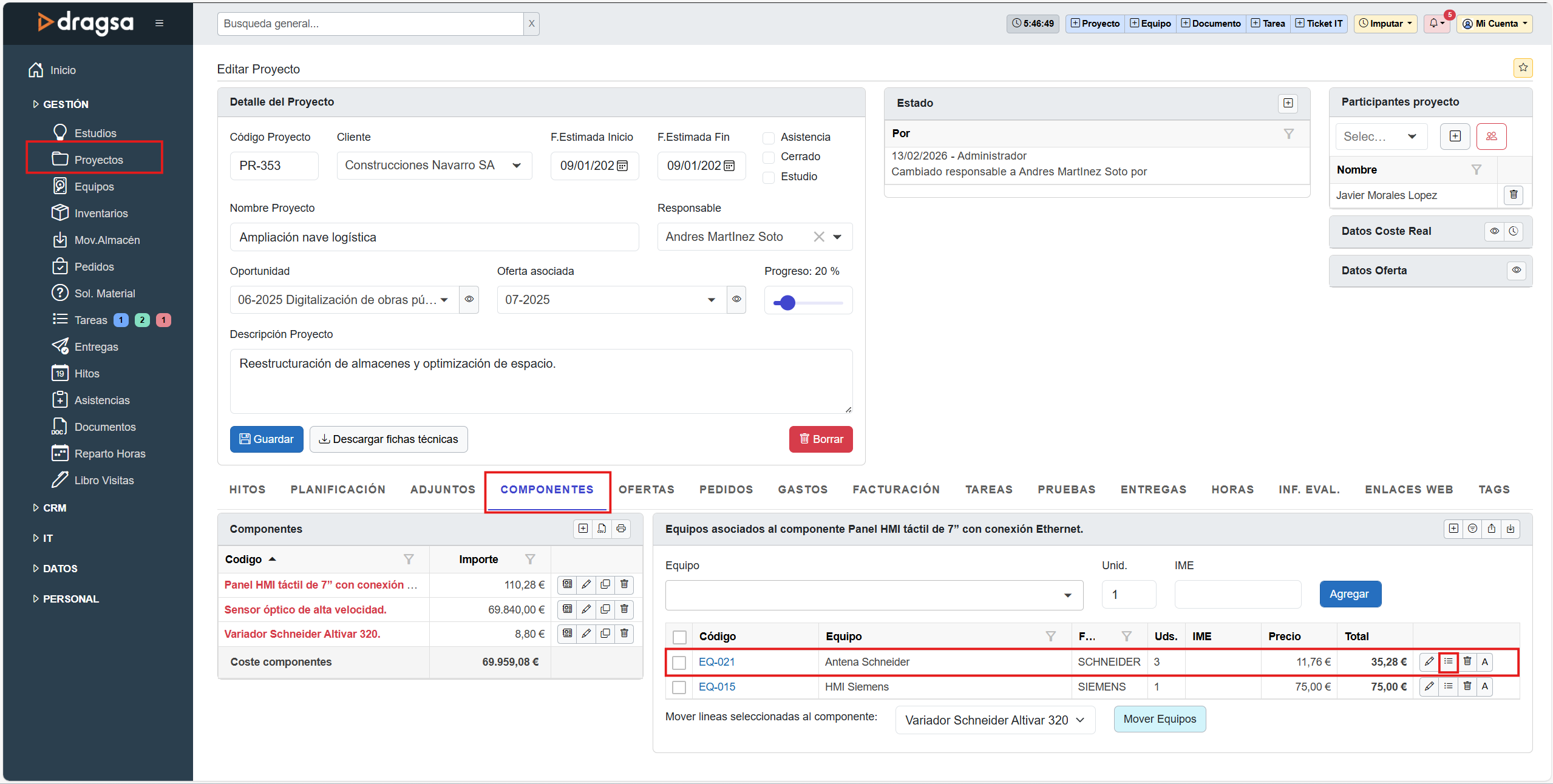 El apartado Equipos del módulo GESTIÓN permite registrar, consultar y mantener actualizado el inventario de equipos y materiales utilizados en los proyectos. Cada equipo incluye información técnica, precios, stock, atributos, documentos asociados y proyectos donde se ha utilizado.