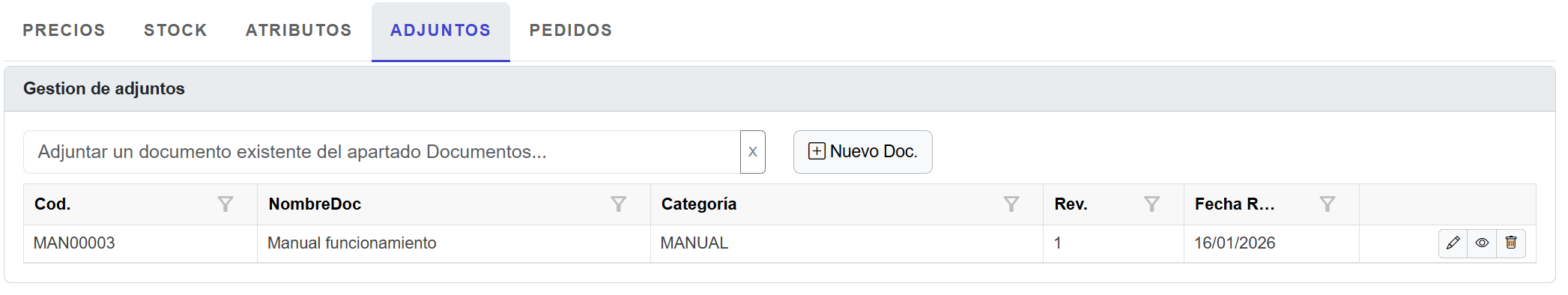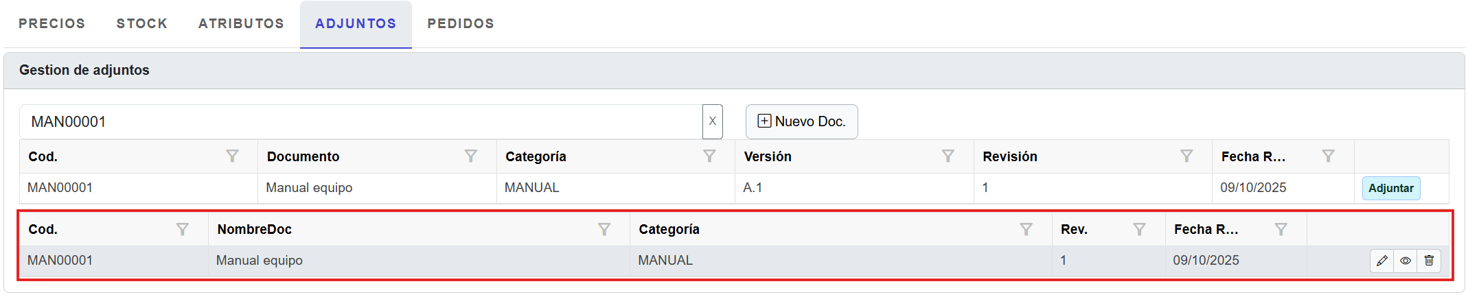 ✔ Asociar un documento existente ![]() 1. Buscar el código de documento. 2. Pulsa Adjuntar 3. Ahora el documento se visualiza dentro del listado tabular. ![]()