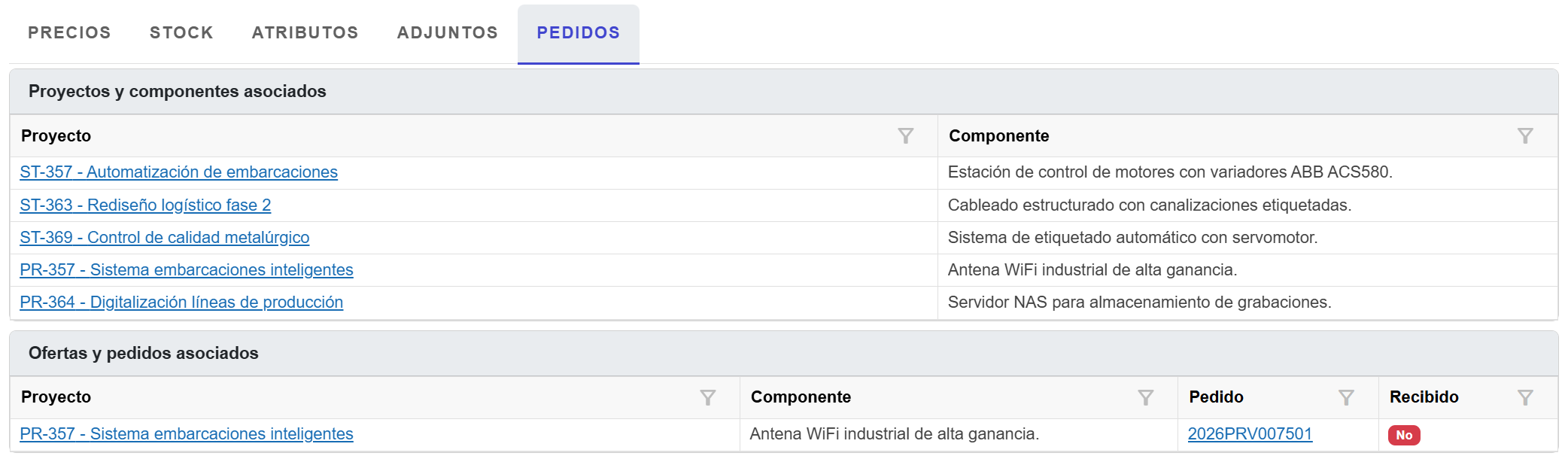 ✔ Información tratada Se muestra en la tabla los proyectos en los que el equipo está asociado y en los que se ha realizado un pedido del mismo, así como un acceso directo a la información del propio pedido.