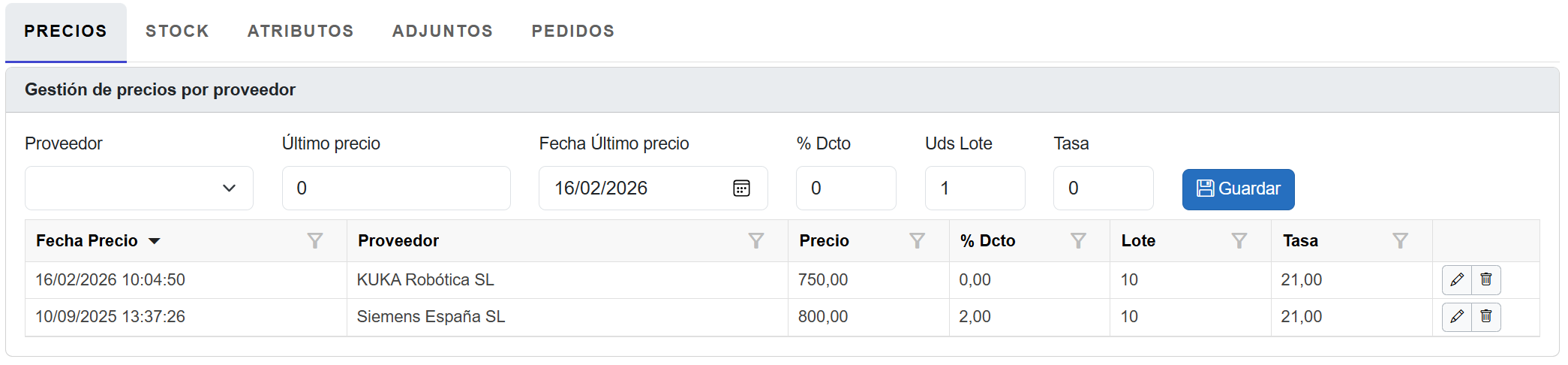 ☑️ Mantener actualizado el último precio y proveedor.