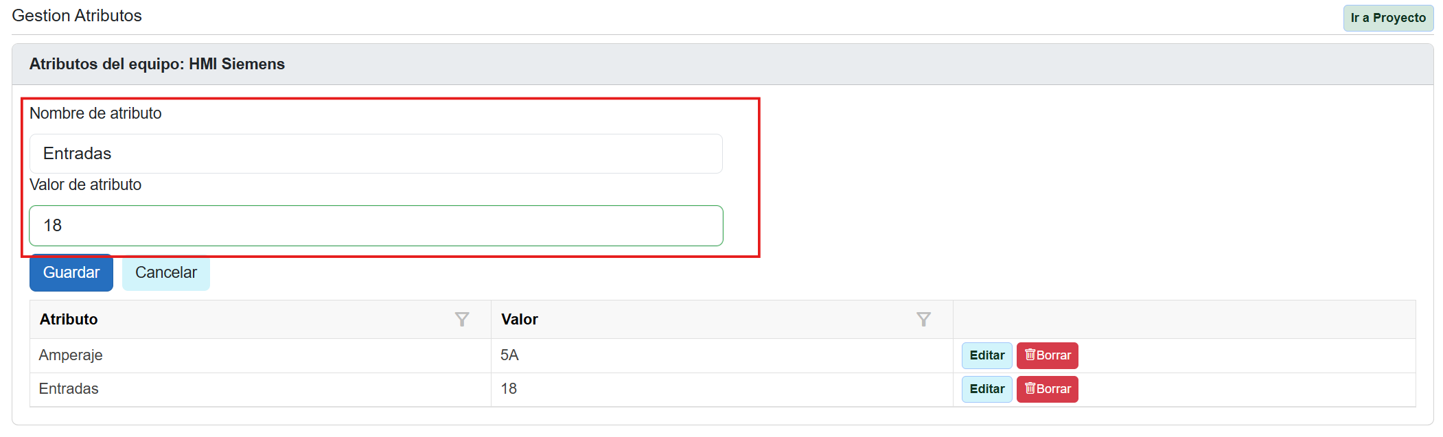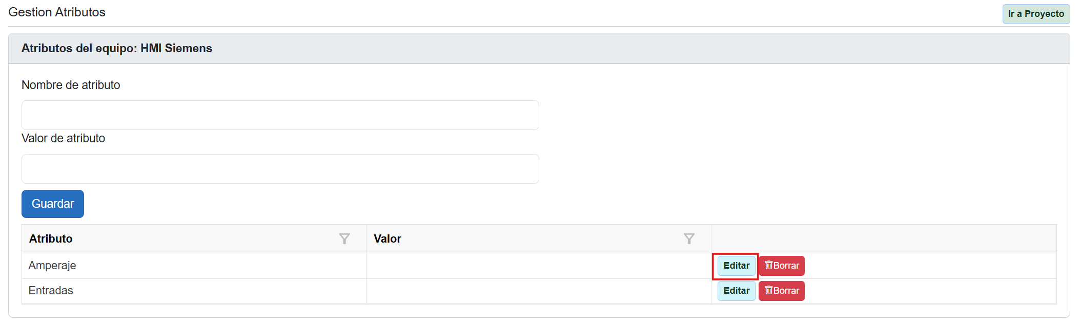 ✔ Editar atributos dentro de la pestaña componentes de un proyecto. 1. Accede a los componentes del proyecto. 2. Pulsa el botón “editar atributos” (≡). ![]() 3. Una vez desplegada la ventana de gestión de atributos, pulsar editar atributo para añadirle un valor específico al componente asociado a ese proyecto concreto. ![]() 4. La edición se realiza en el campo superior y queda designado en el inferior. ![]() 5. Pulsar guardar