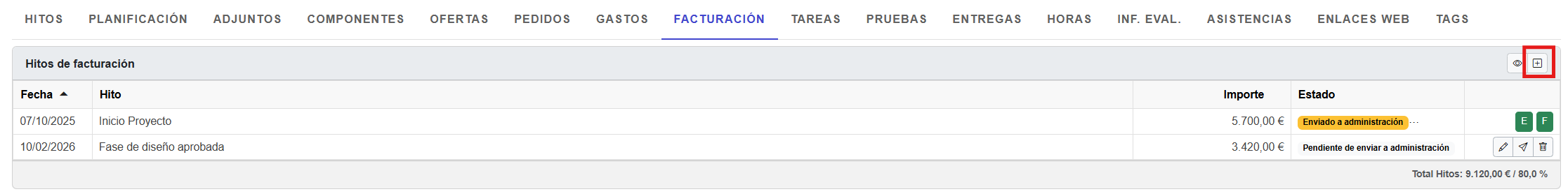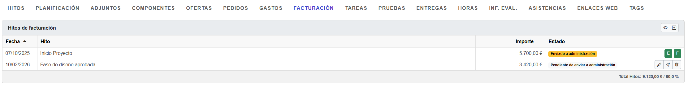 Una vez haya sido enviado a ERP, el estado del hito pasará a “Enviado a administración” y aparecerá a la derecha el botón de acción (“E”🟢).