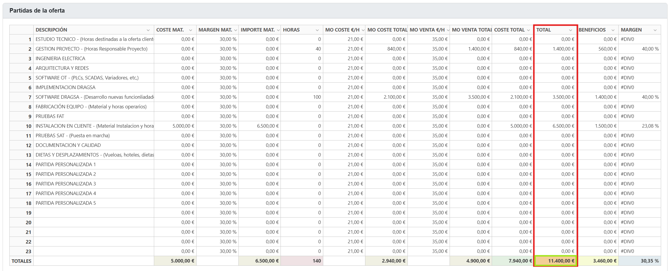 ✅ Facilita el seguimiento económico al mostrar importes facturados, pendientes y totales ofertados.