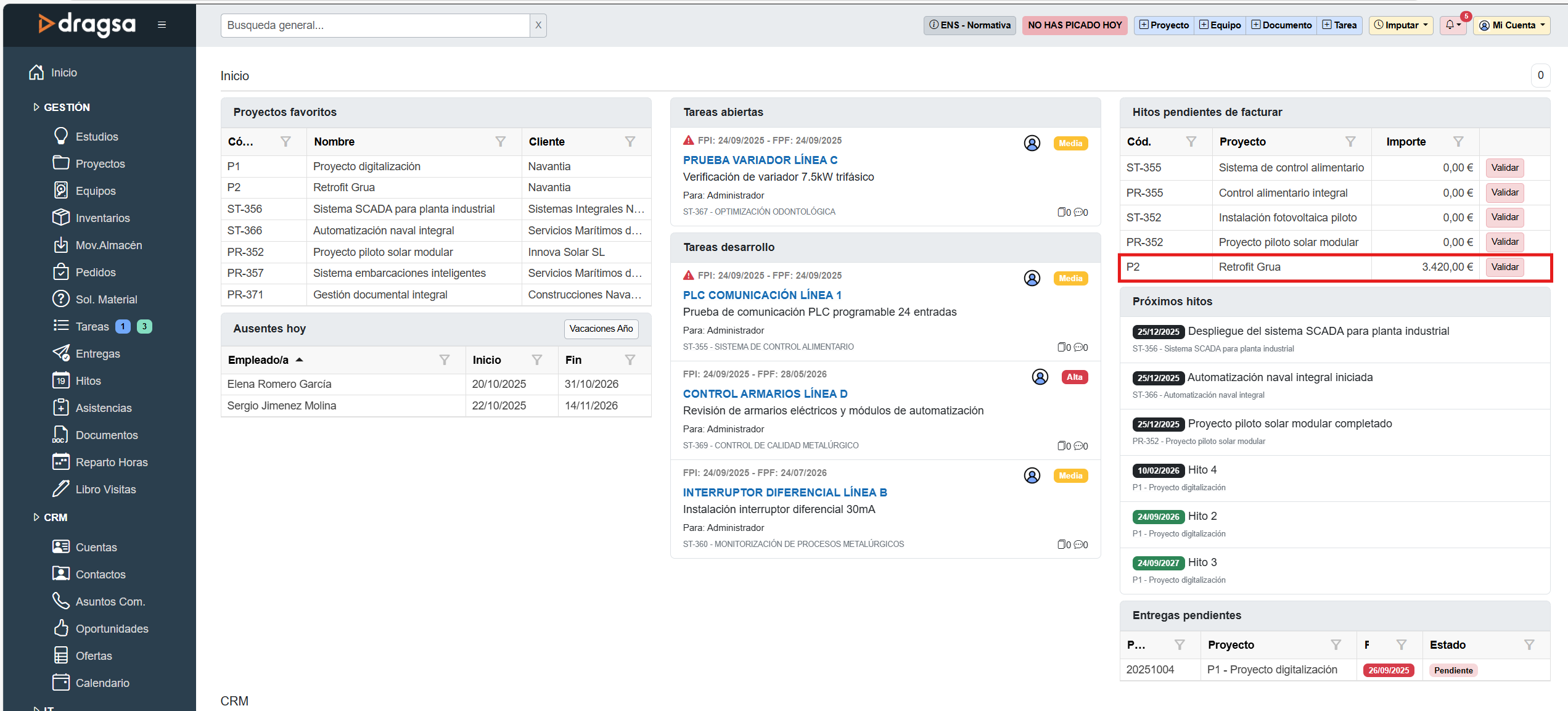 🏠 Pantalla de Inicio - “Hitos pendientes de facturar”. ![]() 💶 Pantalla de Facturación - “Hitos de facturación”. ![]()