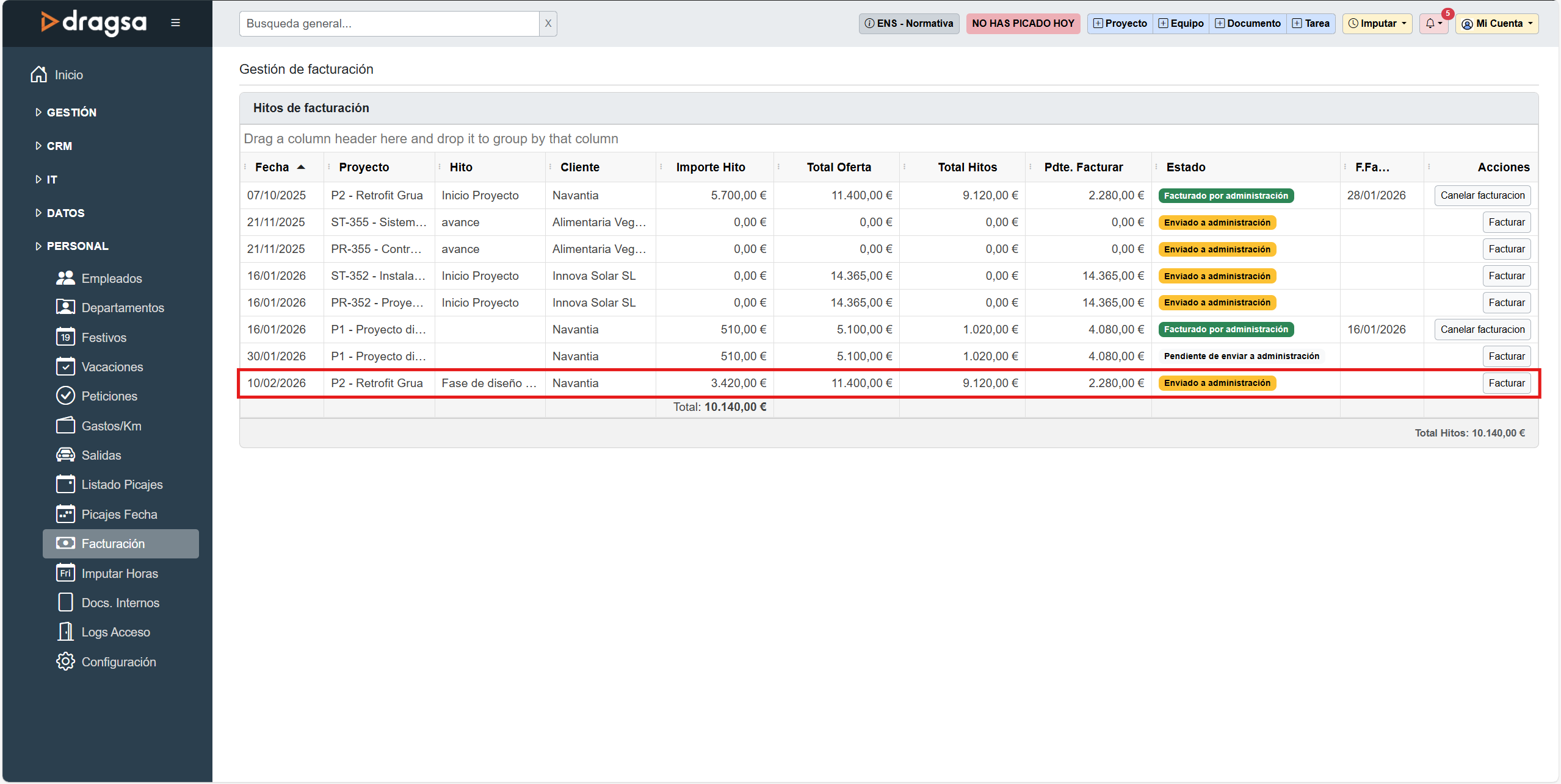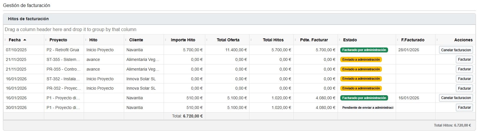 La pestaña Facturación permite gestionar los distintos hitos de facturación asociados a los proyectos en curso. Desde este apartado es posible consultar el estado de cada hito, revisar los importes pendientes y realizar las acciones necesarias para avanzar en el proceso administrativo de facturación.