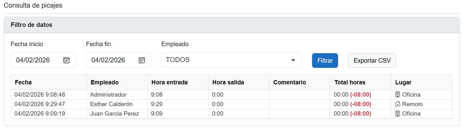El módulo ofrece un acceso rápido y filtrable al histórico de picajes, con posibilidad de exportarlo a CSV.
