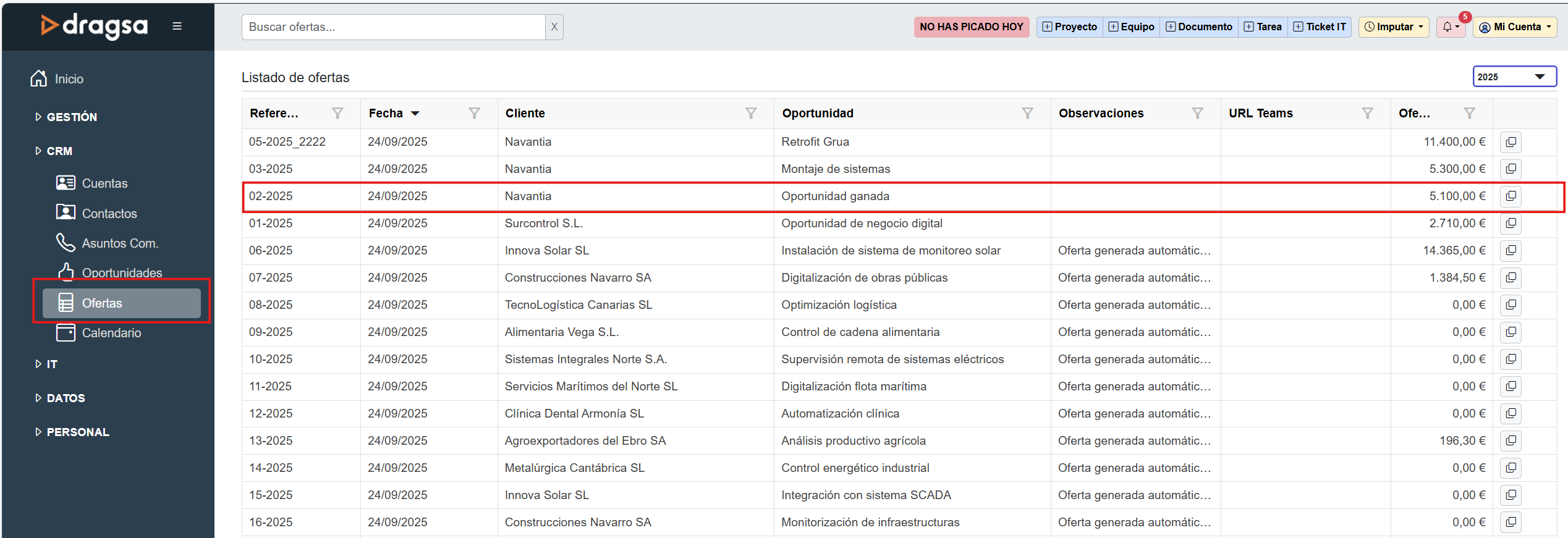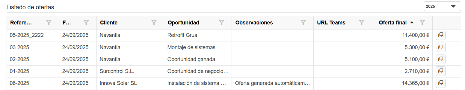 El apartado Ofertas del módulo CRM permite consultar todas las ofertas generadas en el sistema y filtrarlas por año. Cada oferta siempre pertenece a una oportunidad, ya que forma parte del 🔄flujo de trabajo comercial: