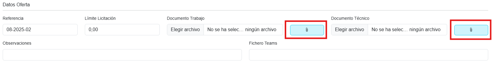 3. Modifica los datos necesarios en la ventana emergente. En caso de adjuntar documentos a la oferta, éstos se visualizarán con los botones (📎) ![]()