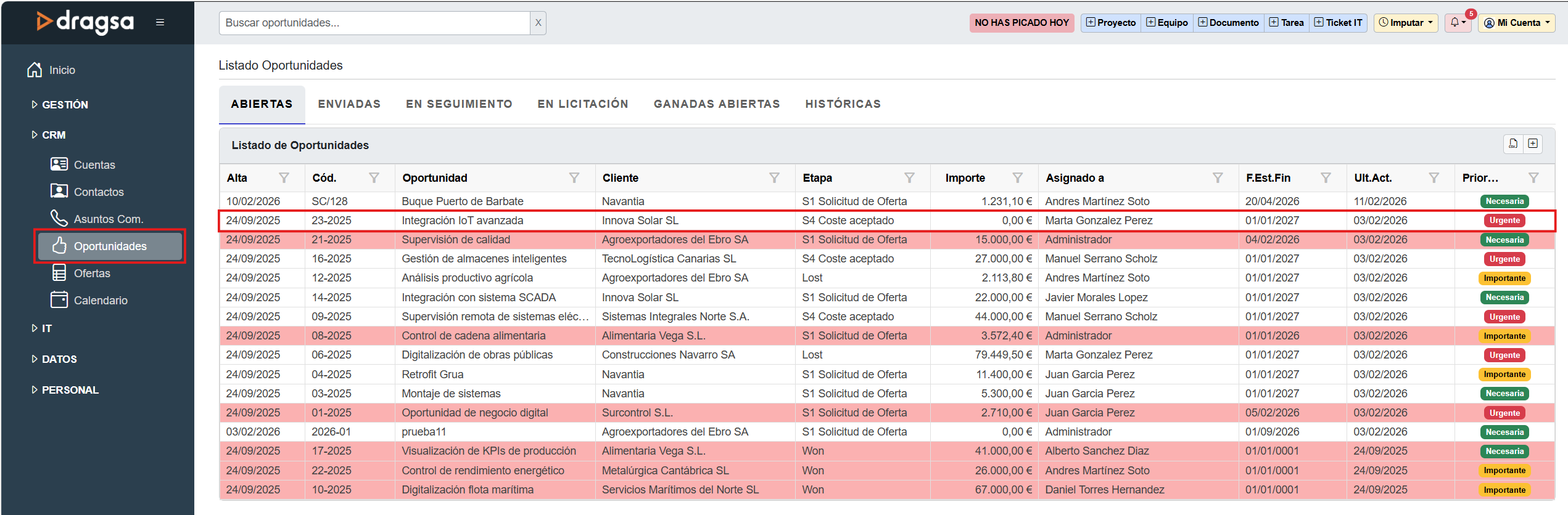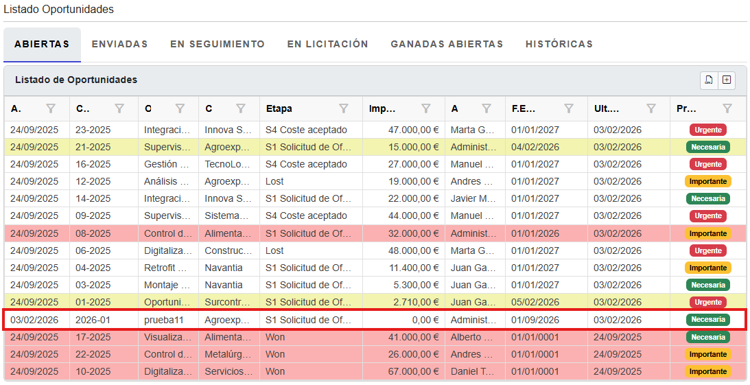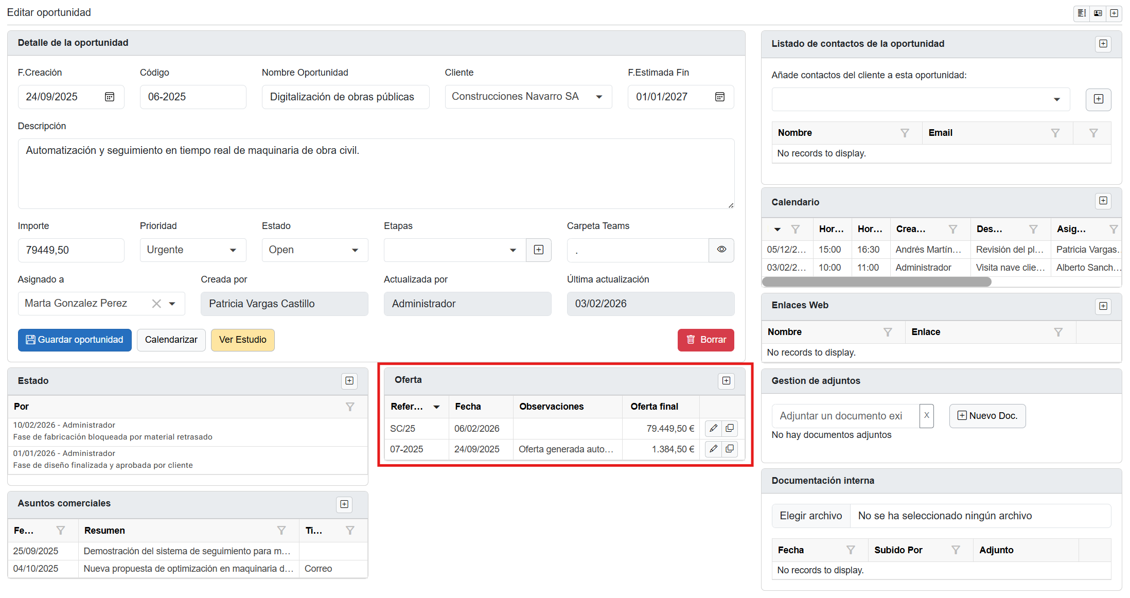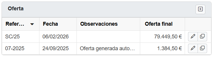 La vista desde cada oportunidad muestra un listado tabular que recoge las ofertas vinculadas a la misma. ![]()