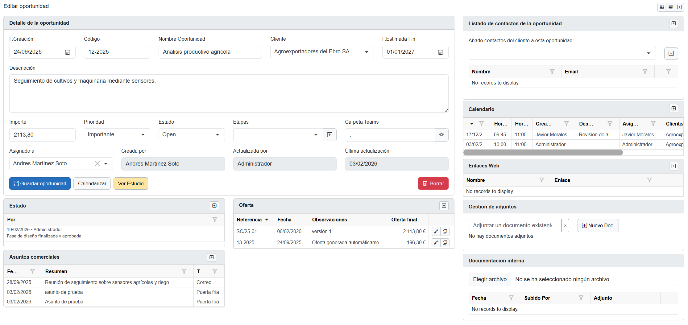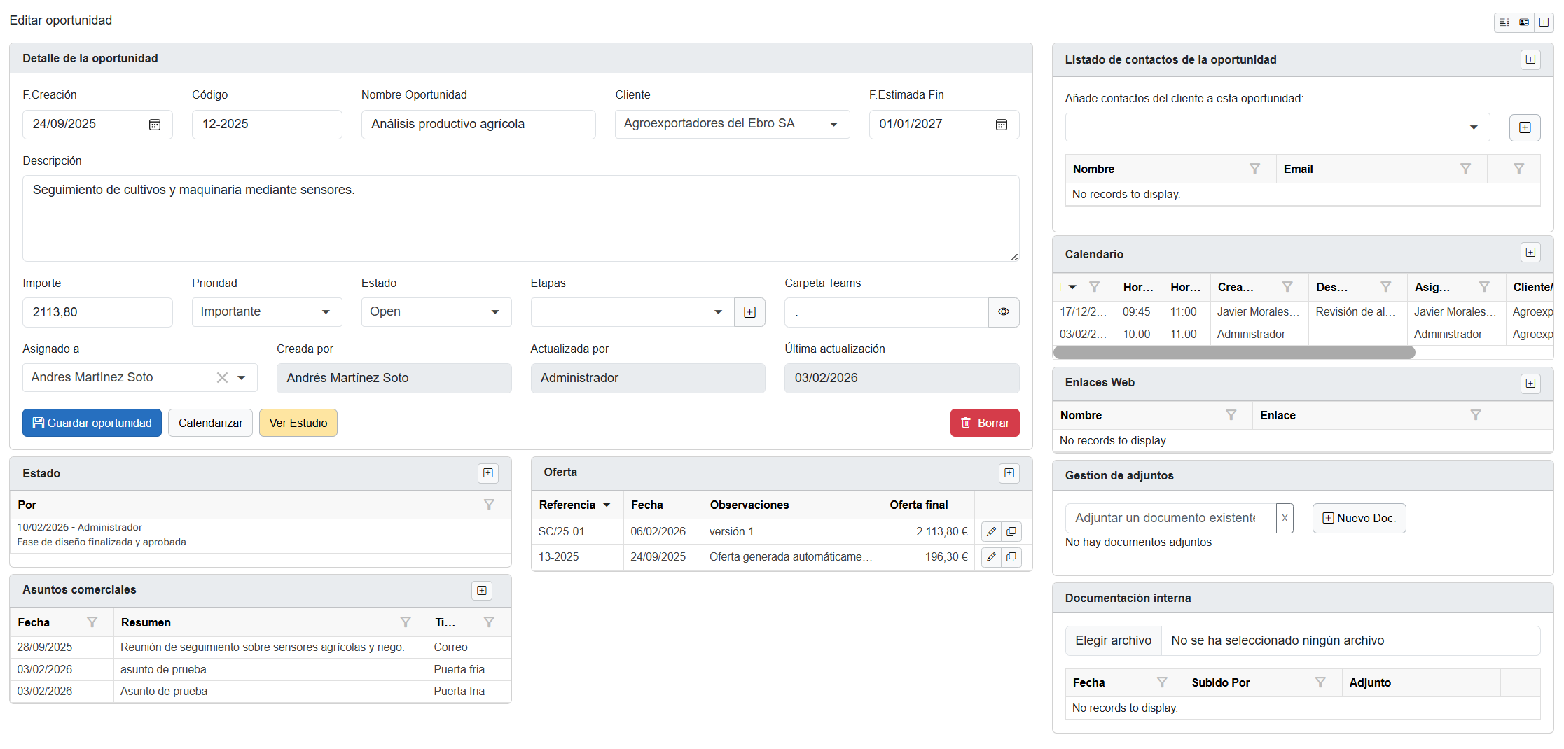Consultar, gestionar y actualizar las propuestas económicas asociadas a cada oportunidad comercial. Facilita el seguimiento del estado de cada oferta y centraliza toda la información relacionada.