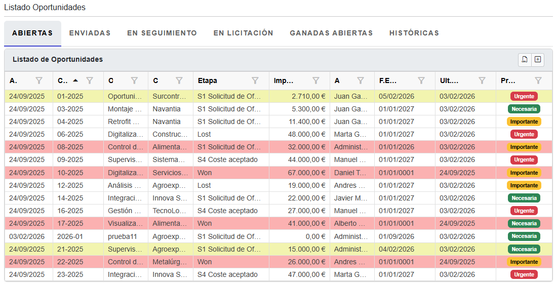 ✔ Pestañas visibles en la ventana La página principal se organiza en un listado tabular dividido en seis pestañas, que agrupan las oportunidades por su estado actual: