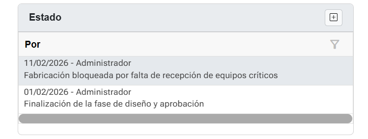 Muestra la información relativa al estado o los cambios que haya sufrido el proyecto o estudio asociado a la oportunidad. En él se indica:
