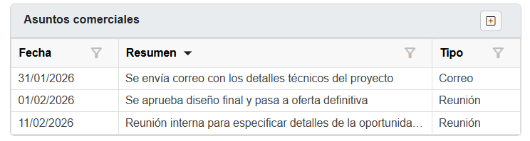 Muestra la información relativa a los asuntos comerciales asociados a la oportunidad. En él se indica: