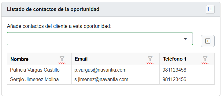 Muestra la información relativa a los contactos asociados a la oportunidad. En él se indica: