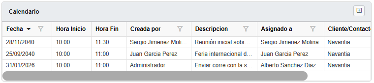 Muestra la información relativa a los eventos del calendario asociados a la oportunidad. En él se indica: