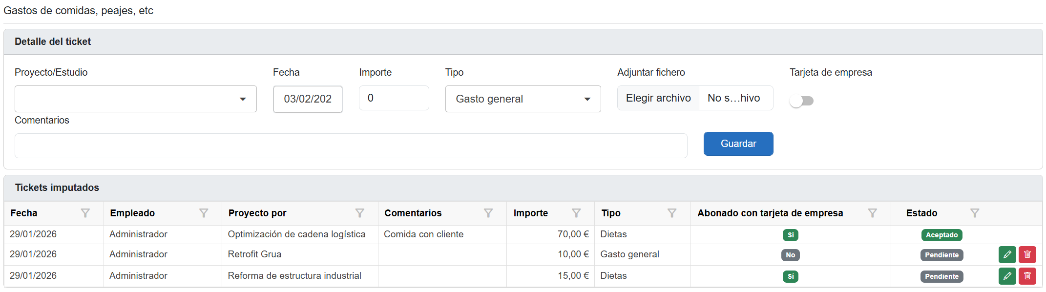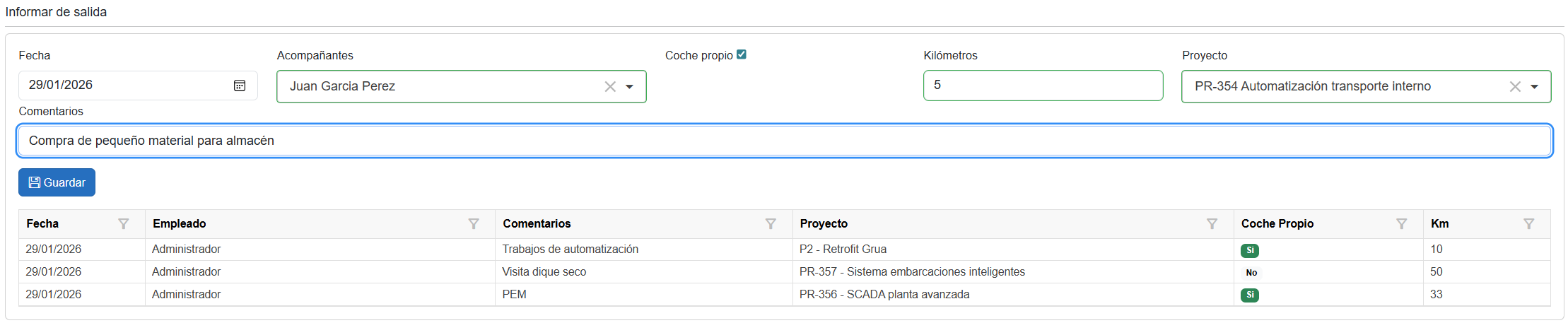 Esta funcionalidad es esencial para el control de gastos de transporte, la planificación de recursos y la correcta asignación de costes a cada proyecto.