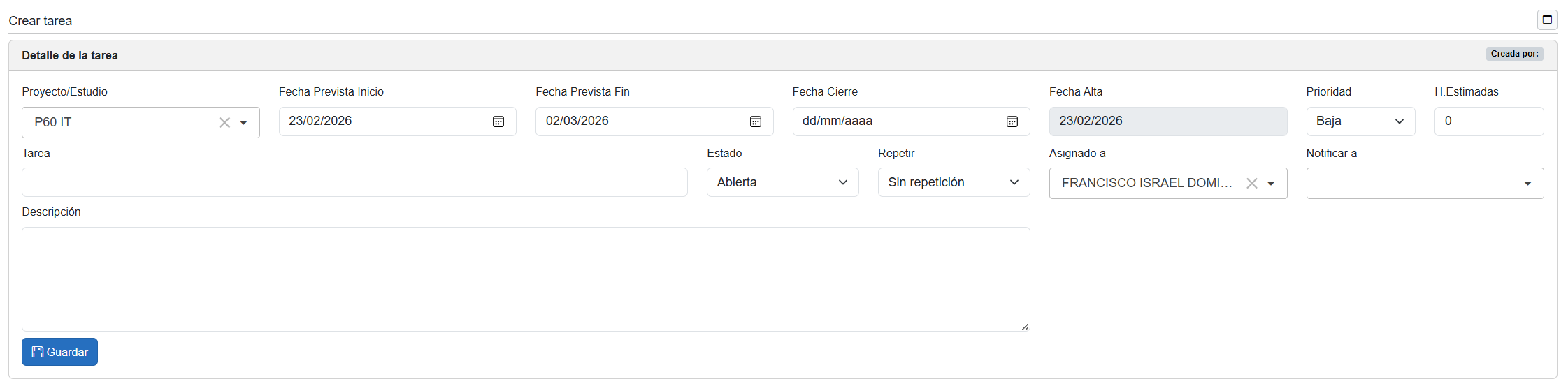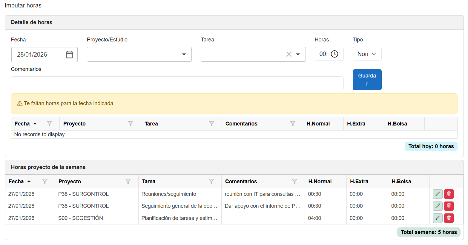 Este apartado está diseñado para que cada usuario asigne sus horas trabajadas a proyectos específicos, indicando la tarea realizada, el tipo de hora y cualquier comentario relevante.