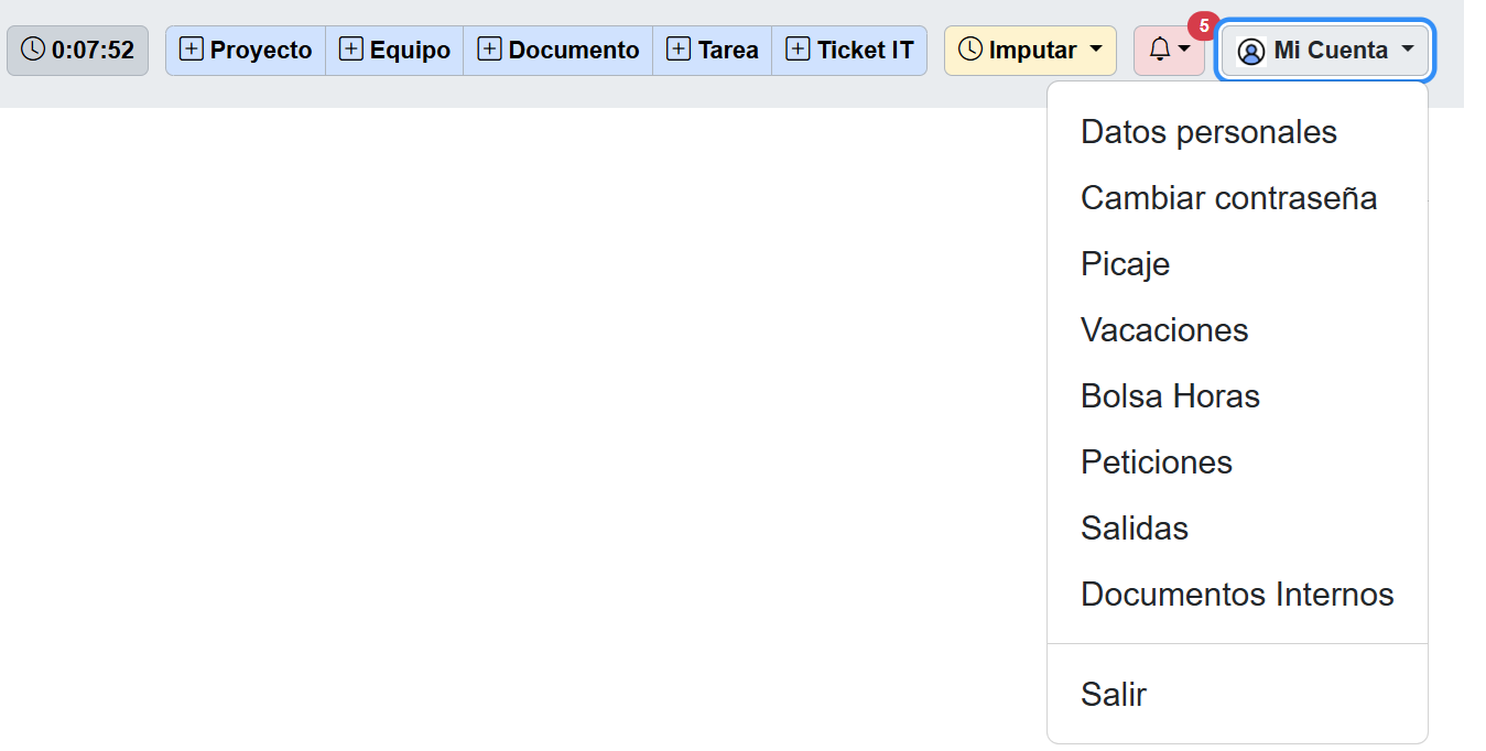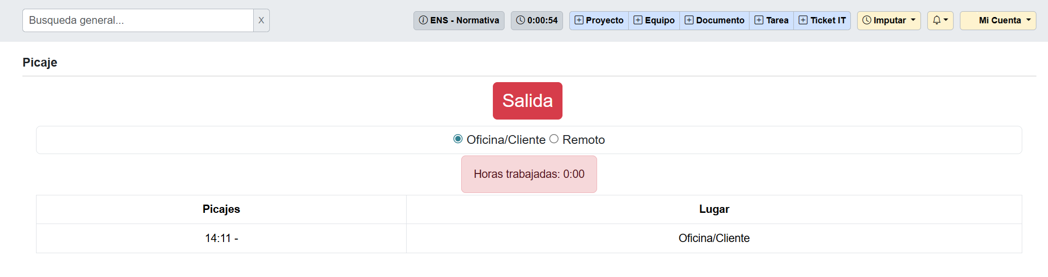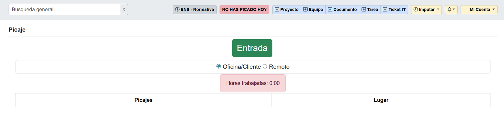 Al pulsar sobre el botón accedemos a la pantalla de Picaje. Permite registrar la entrada y salida del usuario de su jornada laboral, indicando el lugar desde donde trabaja (Oficina/Cliente o Remoto). Partes que lo componen: