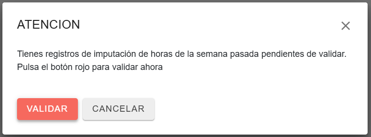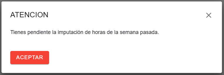 Si se tiene pendiente la imputación de horas de la semana anterior, al pulsar sobre el botón aparecerá una ventana de advertencia para el usuario.