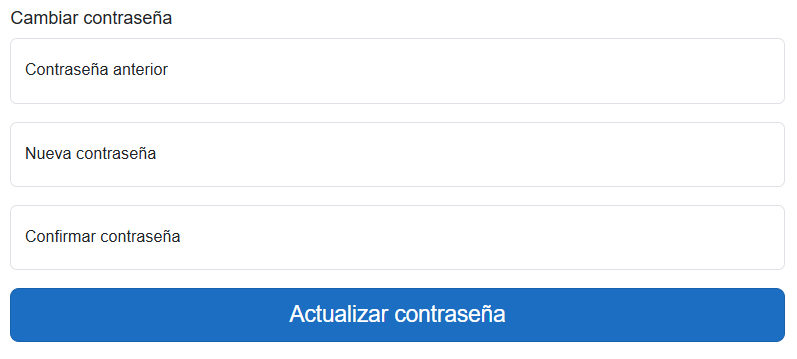 Para actualizar la contraseña solo será necesario ingresar la contraseña actual, la nueva contraseña deseada y confirmarla. Una vez cumplimentados los campos se pulsa en el botón de actualizar contraseña.