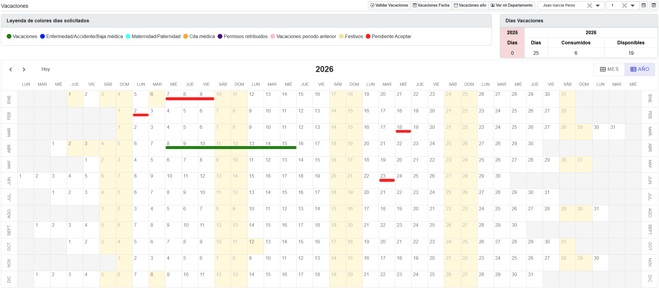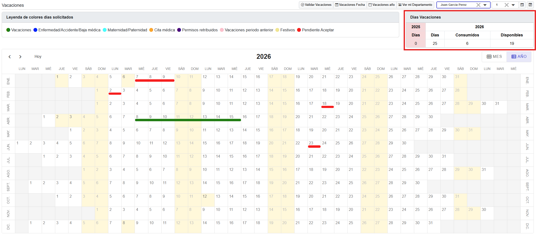 Permite gestionar las solicitudes de vacaciones y otros permisos, mostrando un calendario anual con los días solicitados y aprobados.
