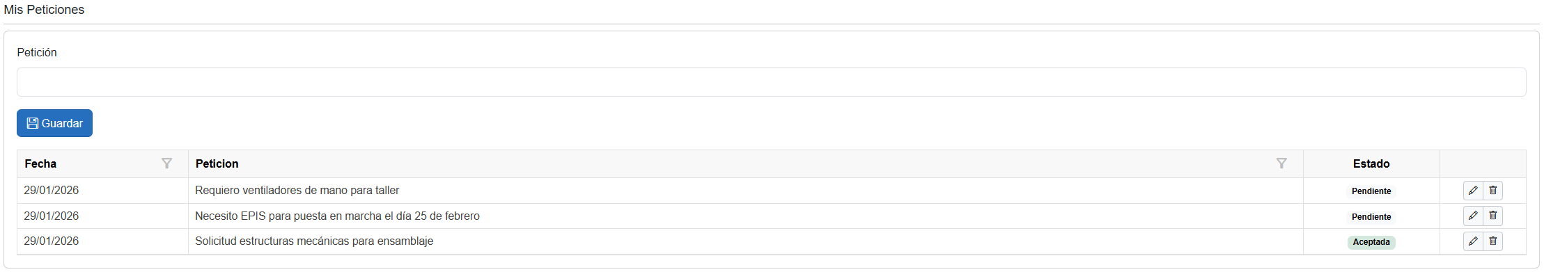 Cada petición se muestra en una lista con la siguiente información: