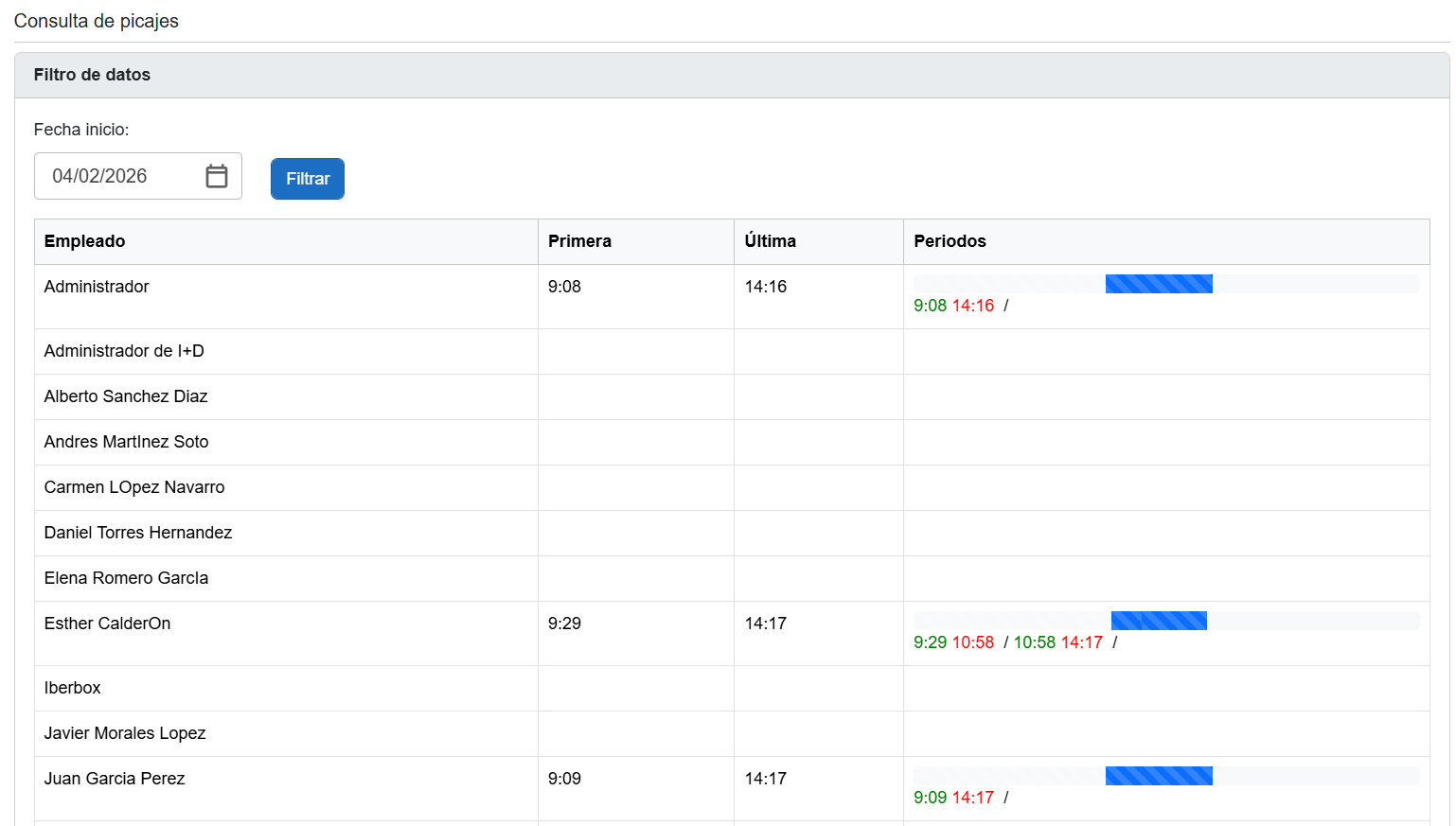 ✔ Tabla de resultados Una vez filtrada la fecha, se muestra una tabla con todos los empleados, tanto si han picado como si no. Columnas visibles: