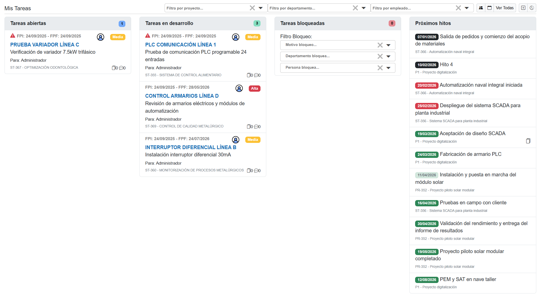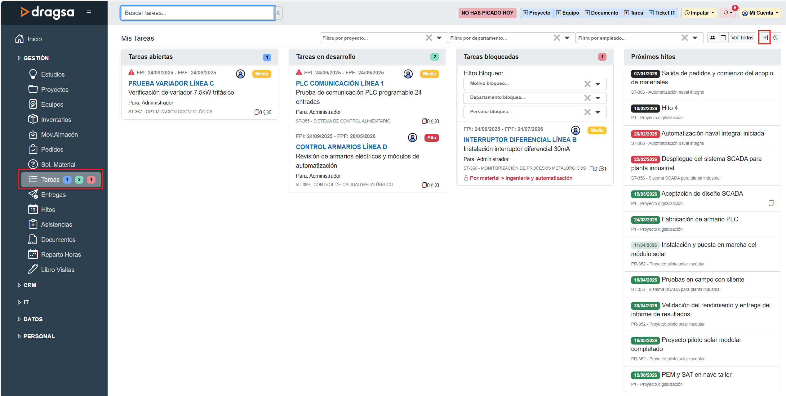 La sección Tareas, dentro del módulo GESTIÓN, permite organizar, asignar y realizar el seguimiento de las tareas vinculadas a los distintos proyectos y departamentos de la empresa. Su objetivo es centralizar la planificación, el avance y la resolución de tareas, permitiendo una gestión visual y ordenada del trabajo diario.