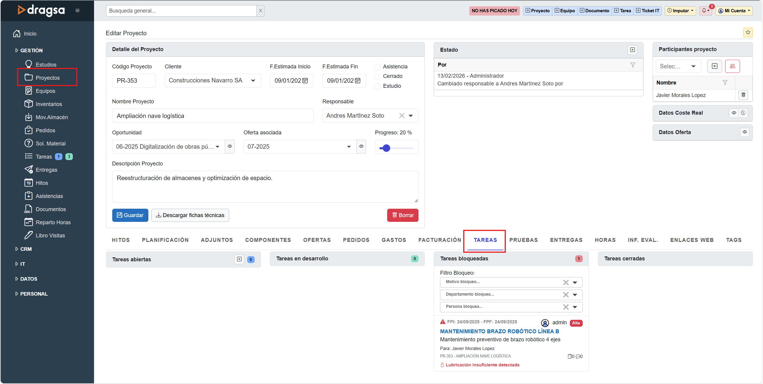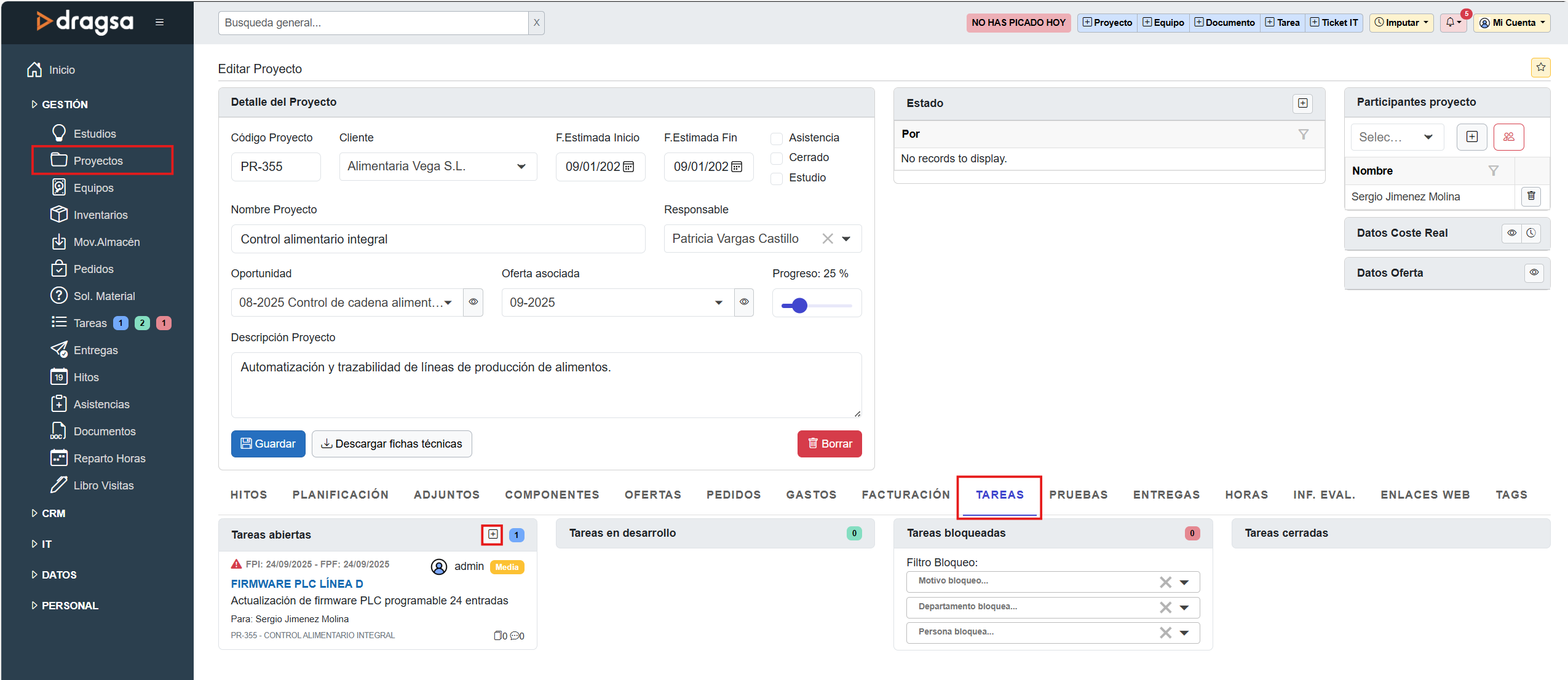 El apartado Tareas permite gestionar de forma estructurada el ciclo completo de una tarea: creación, asignación, seguimiento del estado, registro de horas y cierre, facilitando la planificación operativa de cada proyecto.