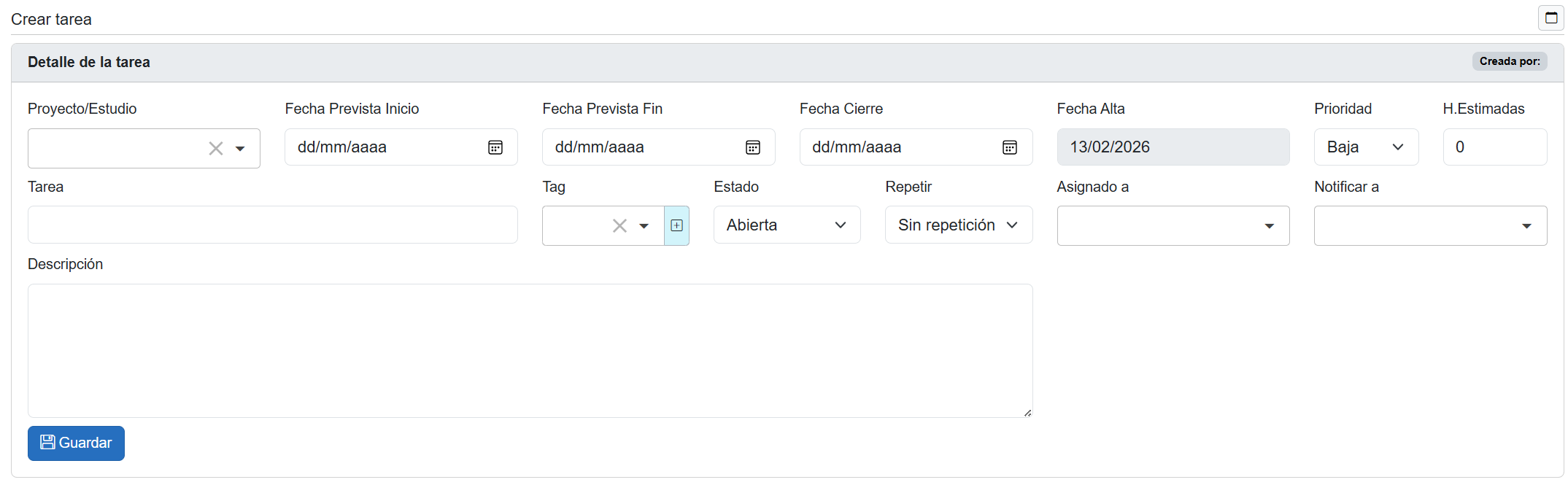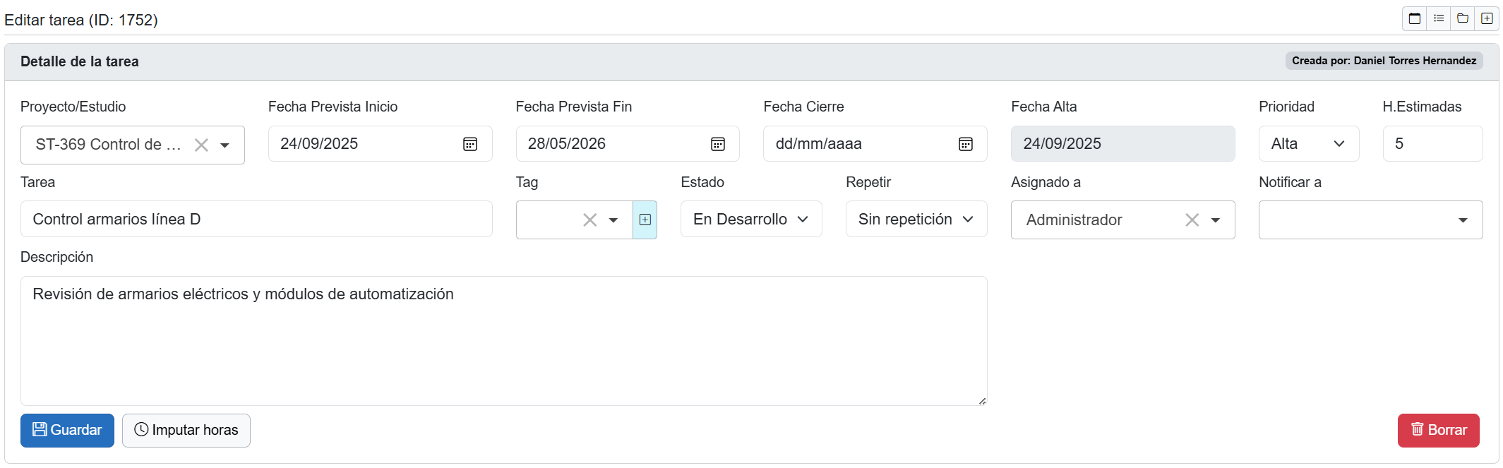 En la parte superior se muestran los campos principales de la tarea: