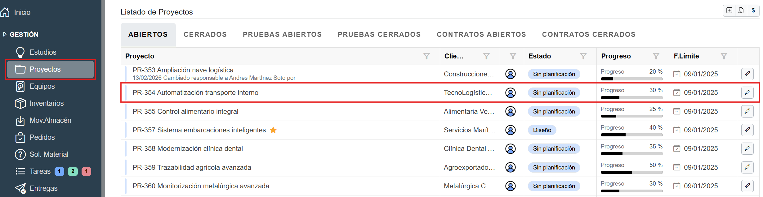 B) Apartado proyectos en el módulo Gestión. 1. Acceder al proyecto en el que se desea editar una asistencia. ![]()