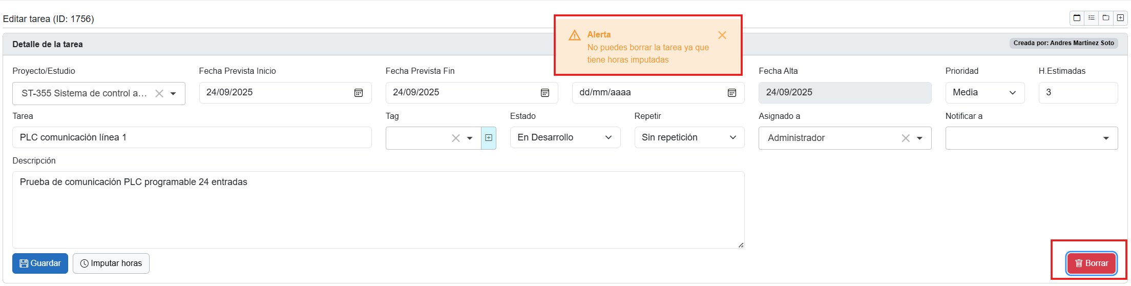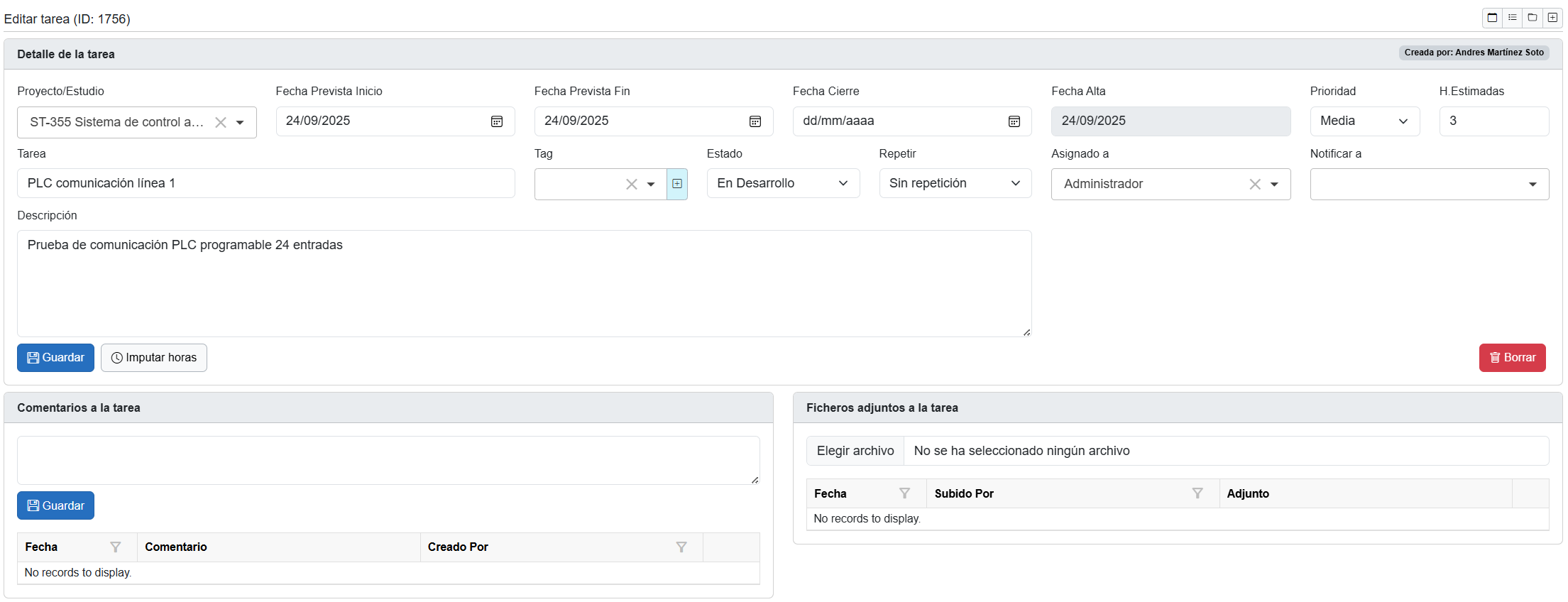 En la parte inferior se muestra el detalle de cada imputación de horas asociada a esta tarea. Incluye: