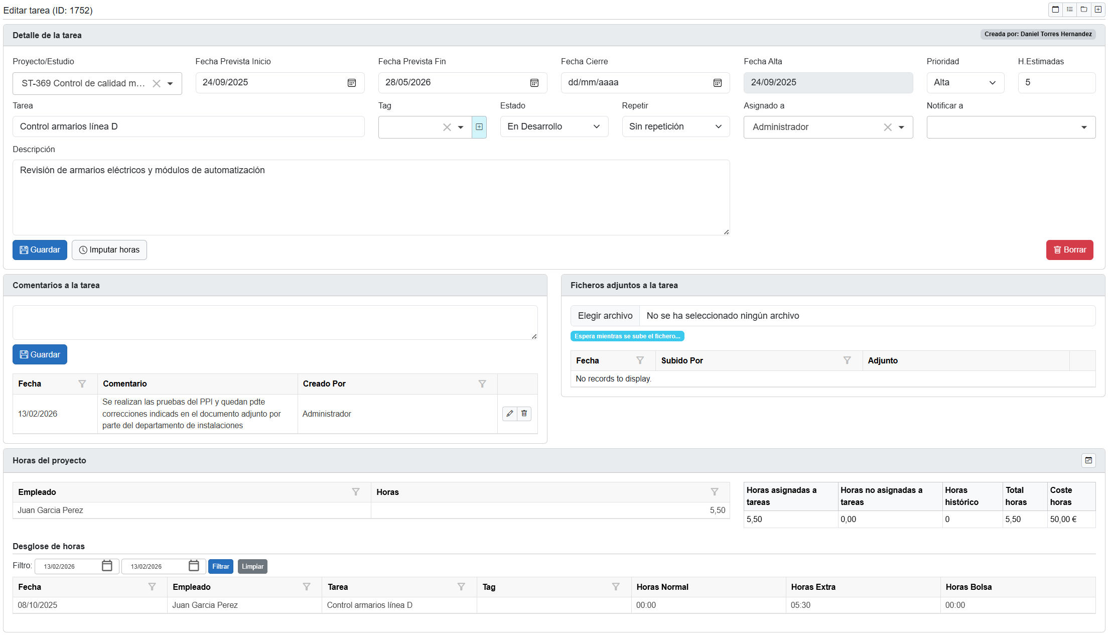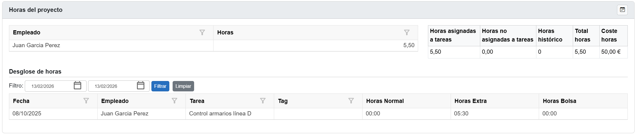 Este bloque resume las horas imputadas al proyecto desde esta tarea o cualquier otra relacionada. Incluye:
