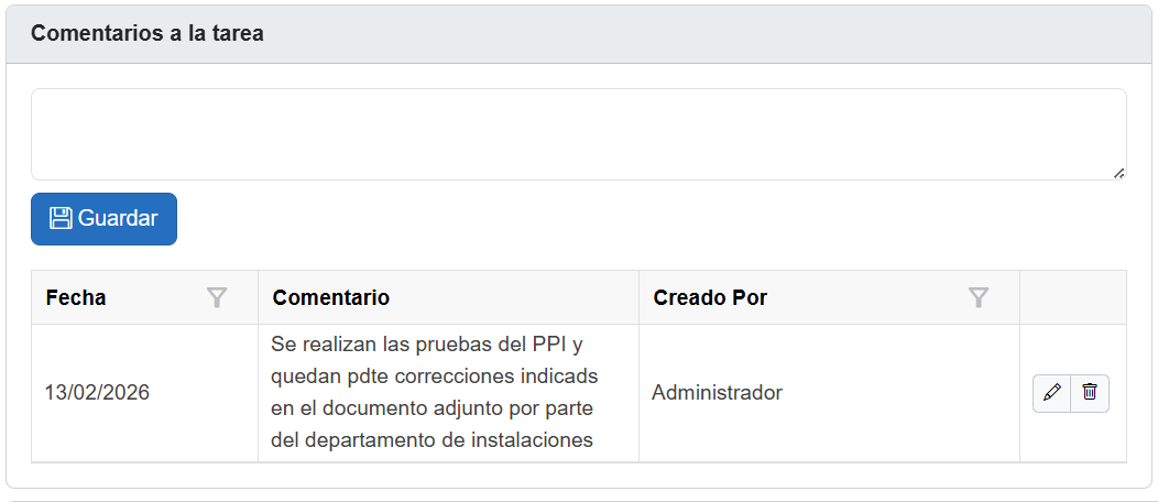 Permite añadir comentarios internos relacionados con la tarea. Incluye: