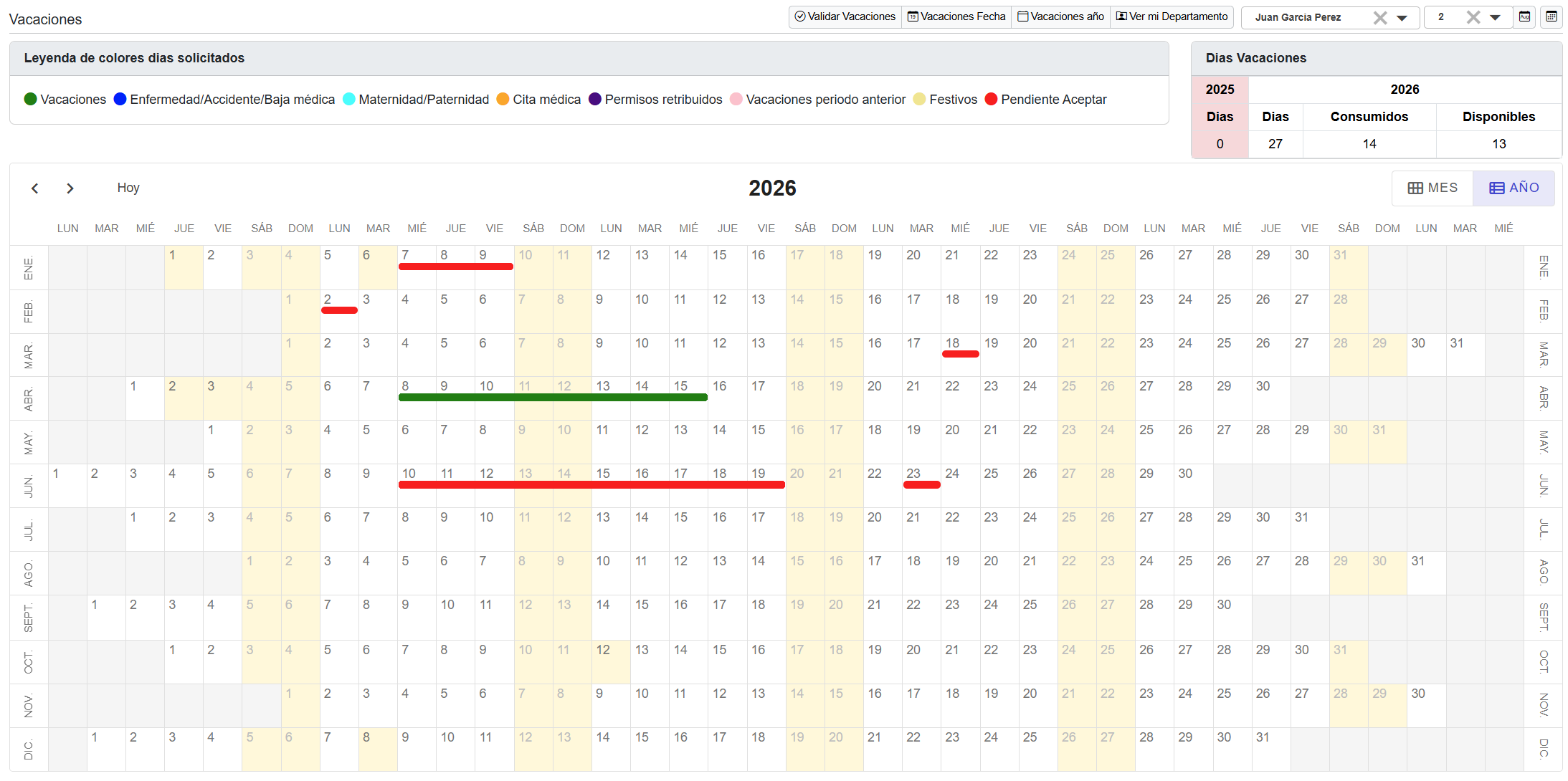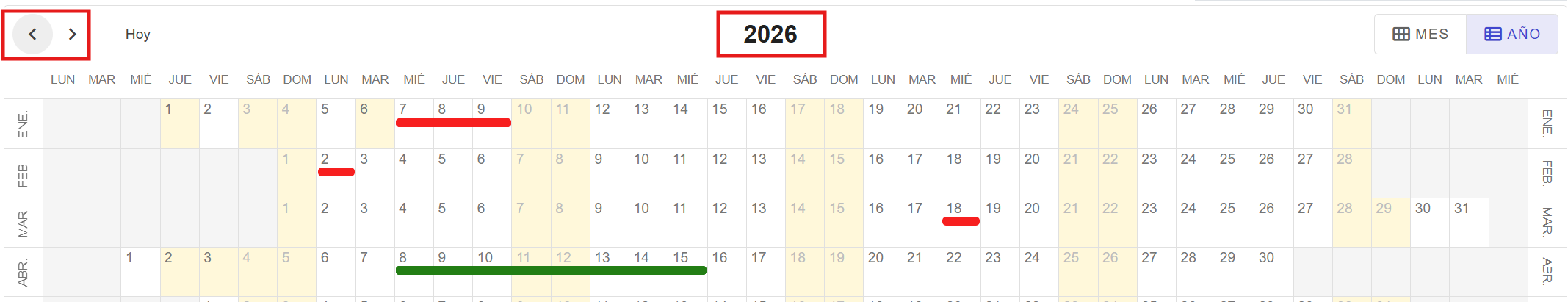 C) Calendario (vista principal) El calendario muestra el año completo o un mes, según la vista seleccionada. Cada día puede estar marcado con colores según la ausencia registrada.