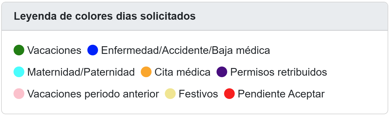 A) Leyenda de colores Indica el significado de cada tipo de ausencia marcada en el calendario: ![]()