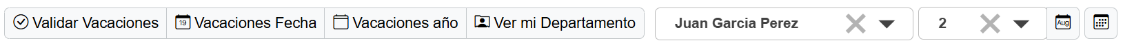 B) Filtros y acciones rápidas En la parte superior derecha se muestran distintos botones y filtros: ![]() 1.Validar Vacaciones. Para aprobar solicitudes pendientes. 2.Vacaciones Fecha. Vista detallada por días seleccionados. 3.Vacaciones año. Resumen anual. 4.Ver mi Departamento. Filtra el calendario por equipo. 5.Selecciona empleado. Selector de trabajadores. 6.Selecciona mes. Navegación mensual. 7.CSV Vacaciones Mes. Exporta un archivo con las ausencias del mes visualizado. 8.Vacaciones CSV. Exportación del resumen global.