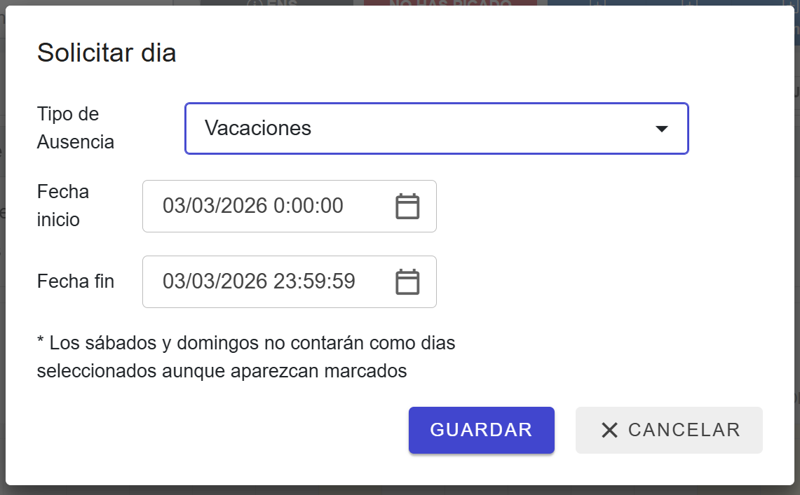 2. En la ventana emergente cumplimentar el formulario en función al tipo de ausencia a solicitar y el intervalo de fechas. ![]()