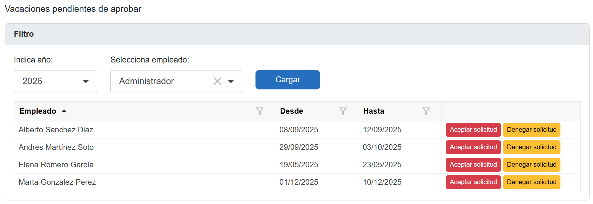 2. Se accede a la pantalla “Vacaciones pendientes de aprobar”. ![]()