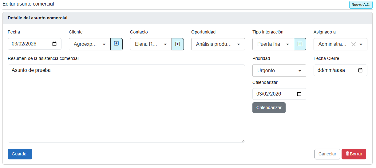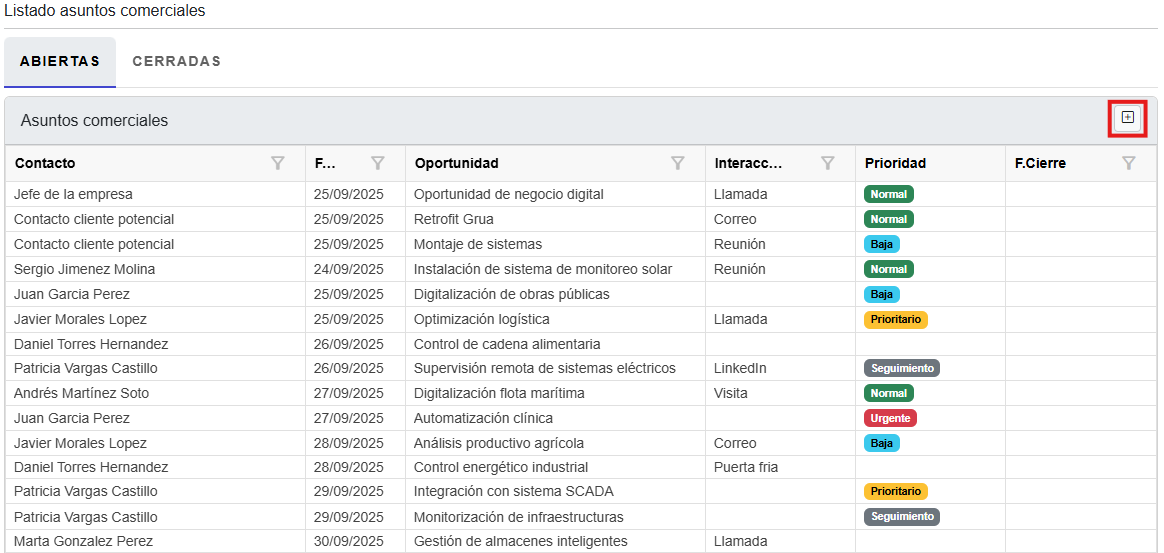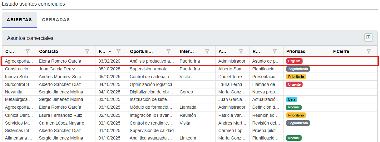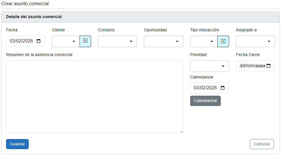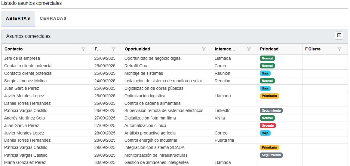 El apartado Asuntos Comerciales del módulo CRM permite registrar, organizar y hacer seguimiento de las interacciones mantenidas con los clientes: llamadas, reuniones, correos, visitas, propuestas técnicas, seguimientos, demostraciones y cualquier otra actividad comercial relevante.